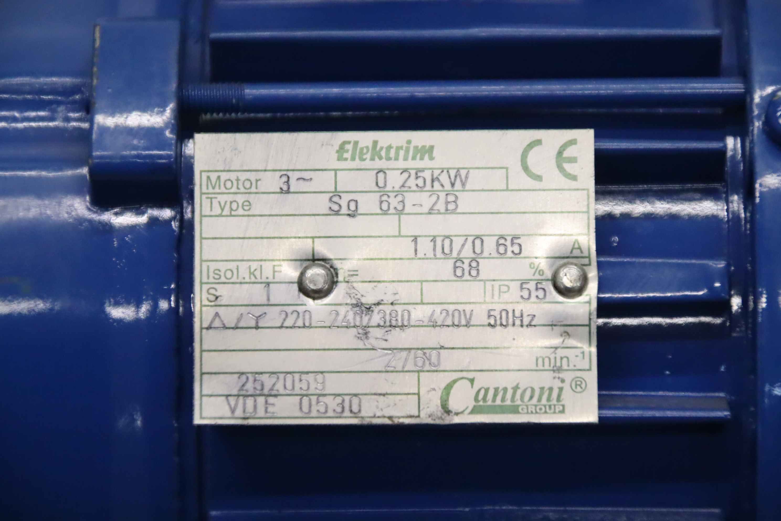 electric motor, three-phase motor-Manufacturer: Elektrim, electric motor type Sg 63-2B-Power: 0.25 kW-Speed: 2760 rpm-Shaft: Ø 11 x 25 mm-Design: B3-Protection class: IP 55-Dimensions: 215/124/H165 mm-Weight: 4.3 kg