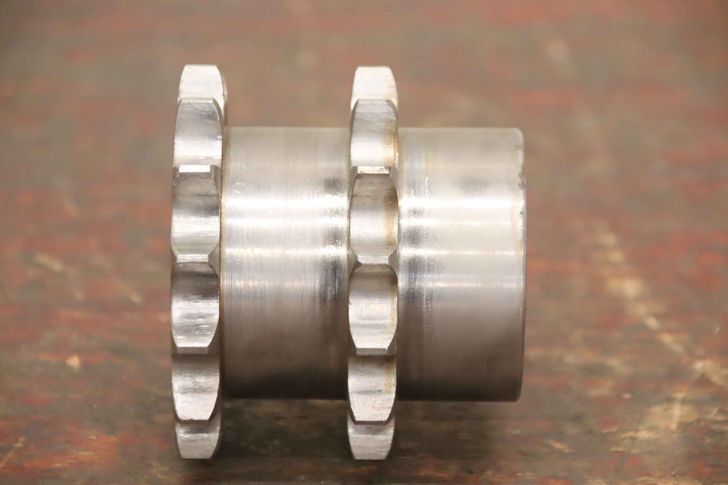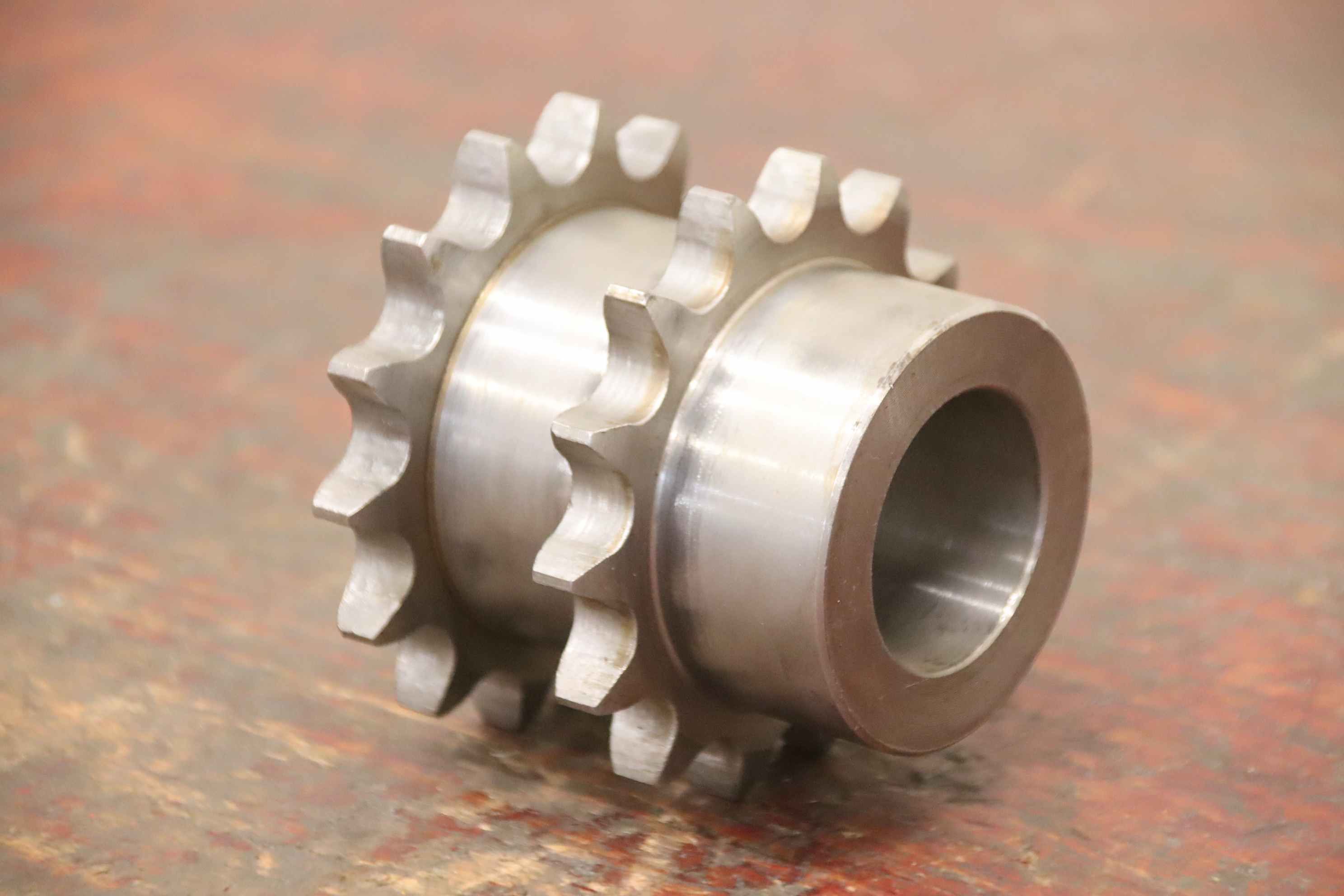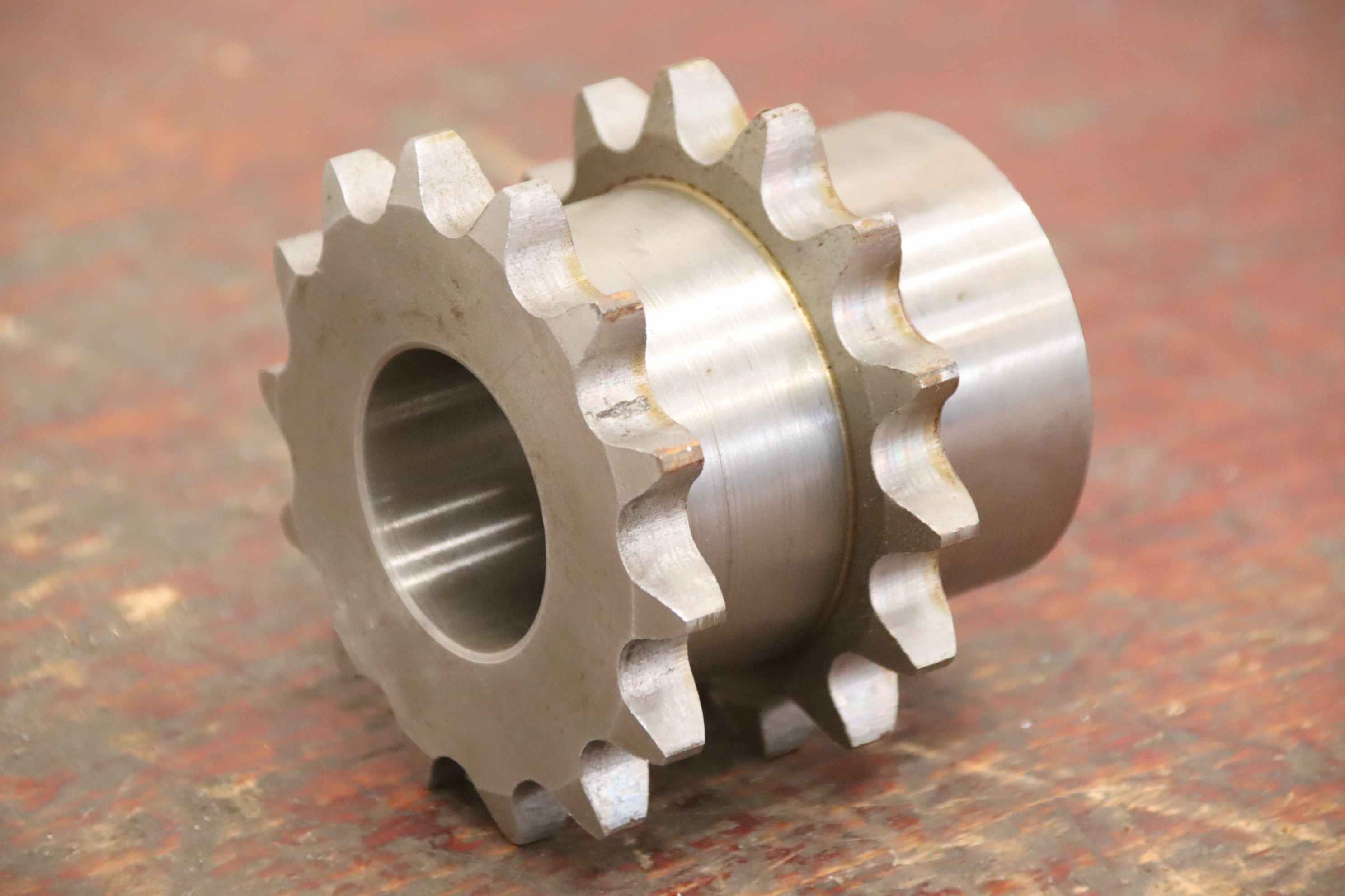 Sprocket, sprockets, single sprocket for roller chain, drive chain, duplex sprocket-Sprocket: 2 pinions, 3/4 inch 14 teeth-Diameter: 93 mm-Shaft mount: inner Ø 40 mm-Dimensions: see photos-Quantity: 70x sprocket available-Price: per piece-Total dimensions: Ø 93 x 80 mm-Weight: 1.5 kg/piece