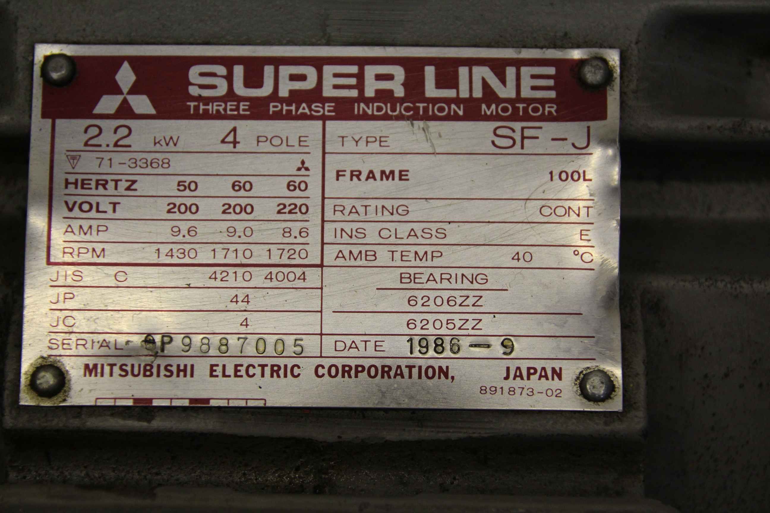 Three-phase motor, electric motor-Mitsubishi: Super Line type SF-J-Power: 2.2 kW-Speed: 1430/1720 rpm-Shaft: Ø 28 x 55 mm-Construction: B3-Dimensions: 360/270/H205 mm-Weight: 30 kg