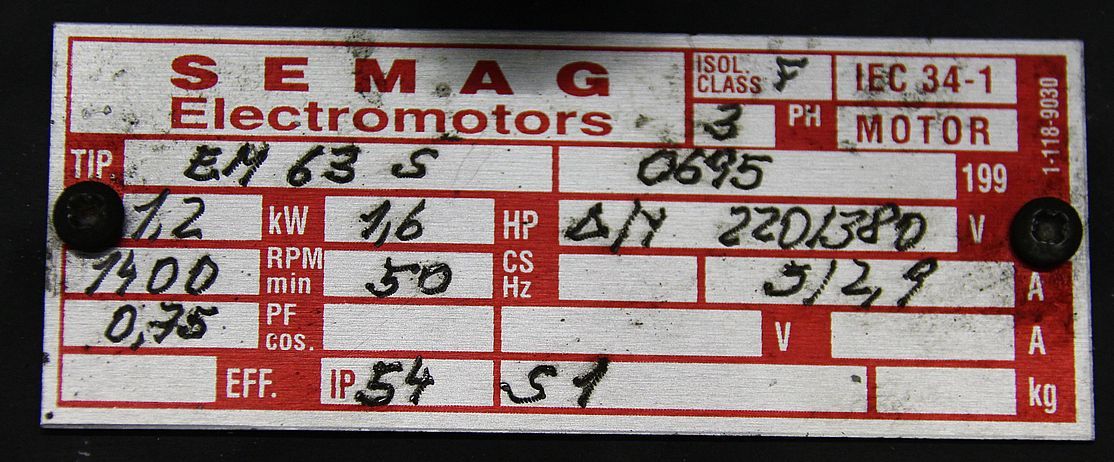 geared motor, electric motor -Speed: 63 rpm -Power: 0.55 kW -Design: B5 angle -Shaft diameter: Ø 30 mm -Brake: 24 V -Protection class: IP 65 -Number: 7x geared motors available Price: per piece -Weight: 36 kg
