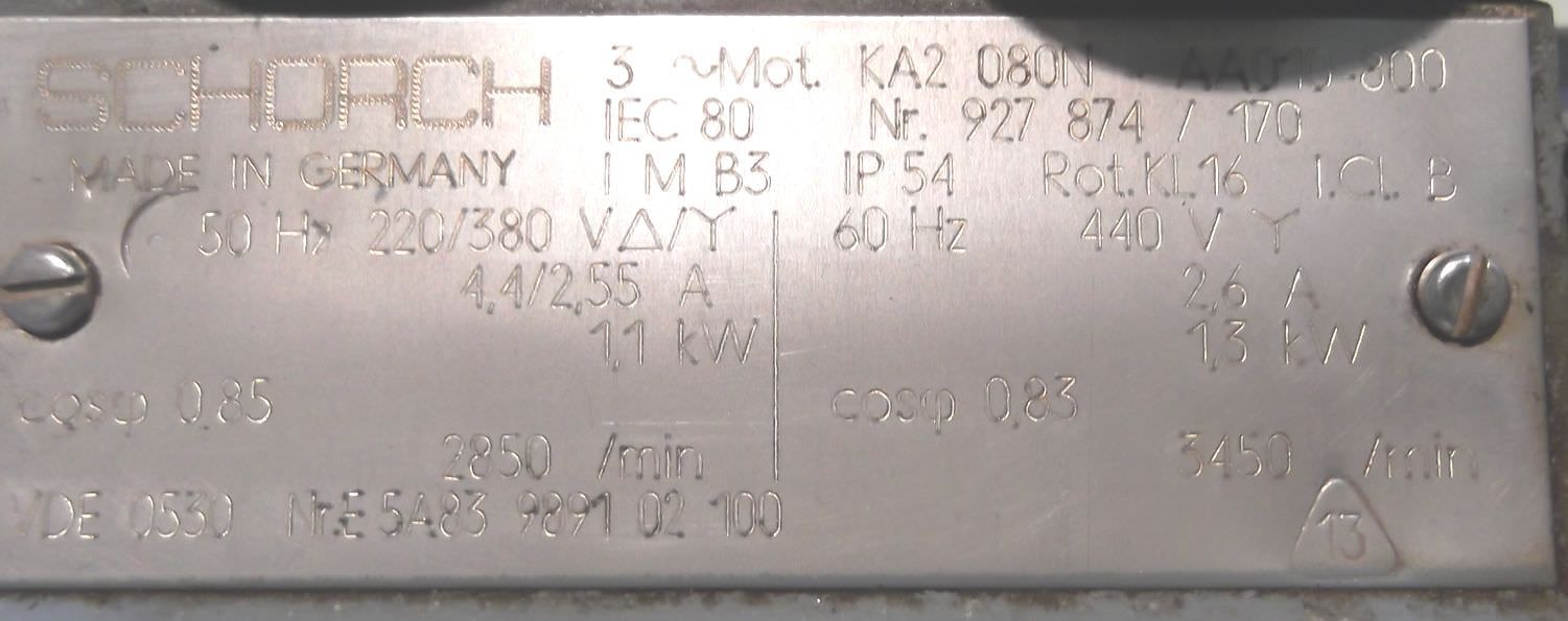 electric motor, three-phase motor-Manufacturer: Schorch, electric motor type KA3280M-BB024-050-Power: 1.1 kW-Speed: 2850 rpm-Shaft: Ø 19 x 40 mm-Design: B3-Protection class: IP 54-Number: 25x available-Price: per piece-Dimensions: 275/156/H205 mm-Weight: 10 kg