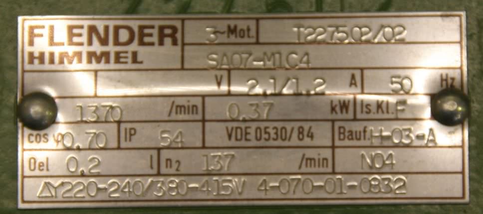 gear motor, electric motor -Speed: 4 rpm -Power: 0.25 kW -Design: B3 -Shaft diameter: Ø 50 mm -Protection class: IP 55 -Number: 1x engine available -Dimensions: -Weight: 73 kg