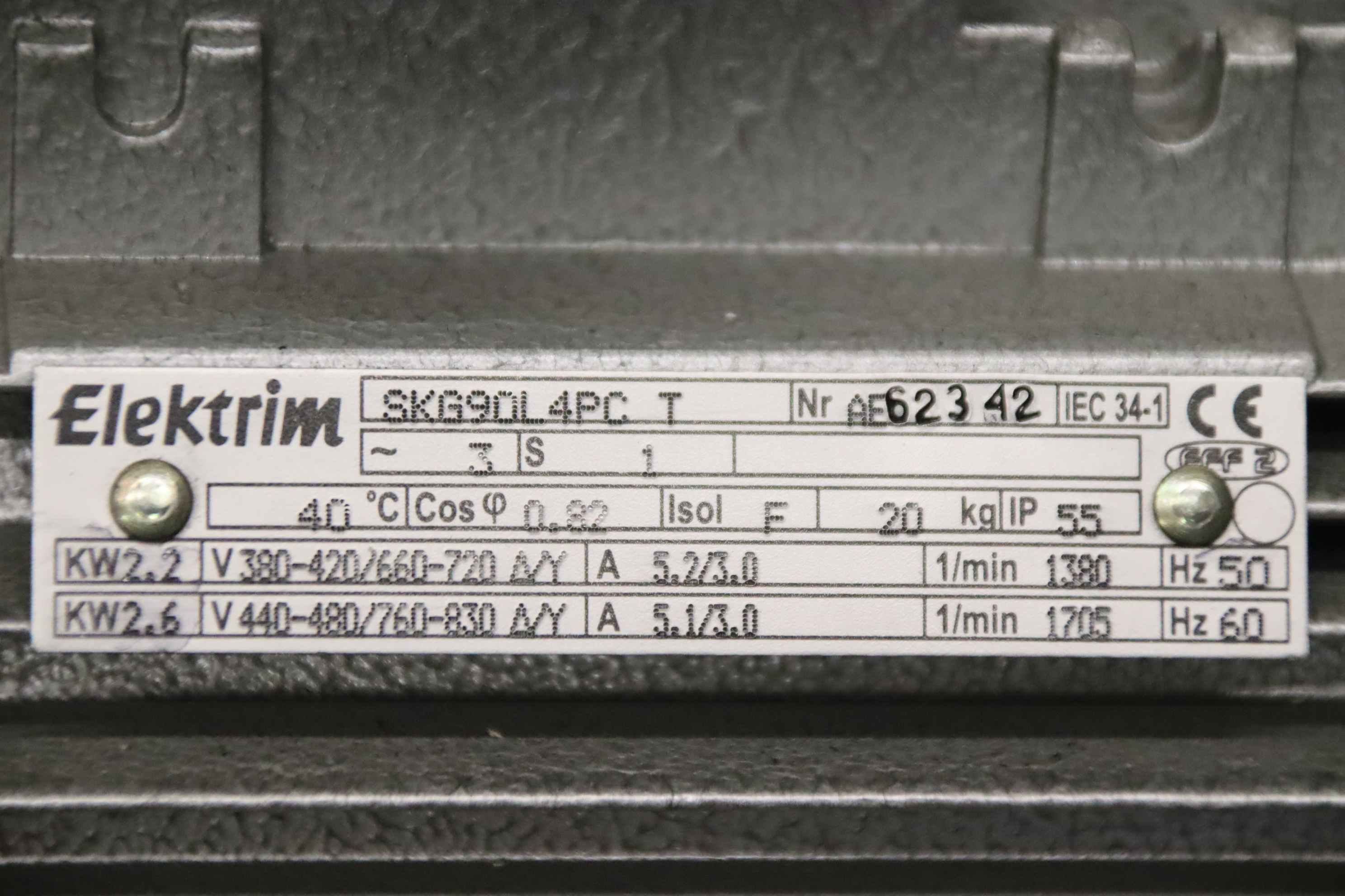 Three-phase motor, electric motor -Manufacturer: Elektrim, Electric motor type SKG90L4PC T -Power: 2.2 kW -Speed: 1380 rpm -Shaft: Ø 24 x 50 mm -Design: B5 -Quantity: 1x motor available -Price: per piece -Dimensions: 350/200/H225 mm -Weight: 21 kg/pc.