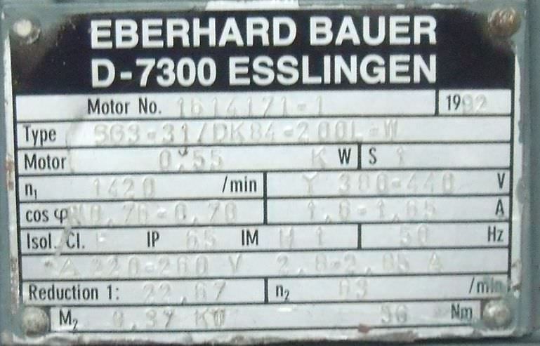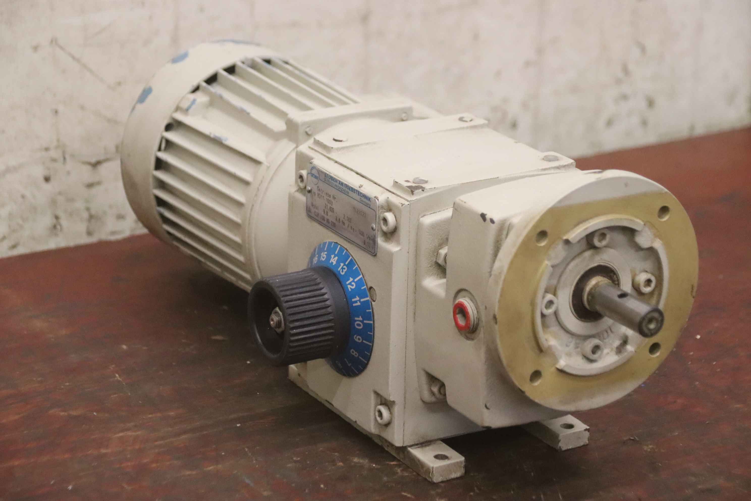 adjustable gear motor, variable speed gear motor, electric motor -Manufacturer gearbox: Stöber type RD11-1003 -Motor manufacturer: ABB Motors Type M2AA071A -Engine power: 0.37 kW -Speed range adjustable: 64-641 rpm -Shaft: Ø15 x 40 mm -Dimensions: 450/210/H180 mm -Weight: 15.7 kg