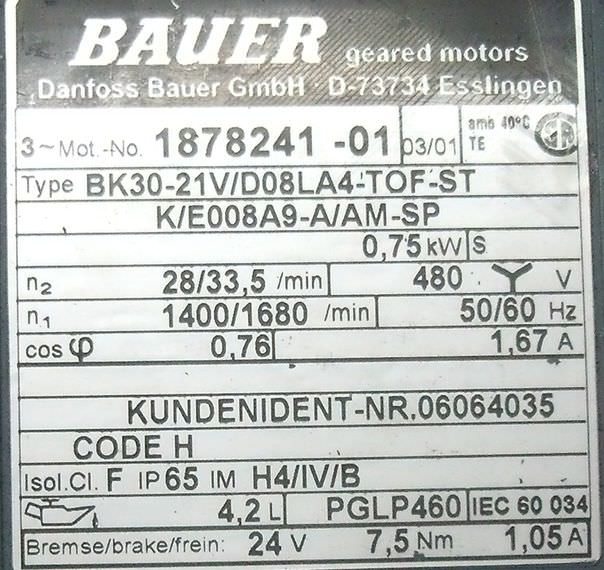 geared motor, electric motor -Speed: 28 rpm -Power: 0.75 kW -Design: B5 angle -Shaft diameter: Ø 40 mm -Brake: 24 V -Protection class: IP 65 -Weight: 55 kg