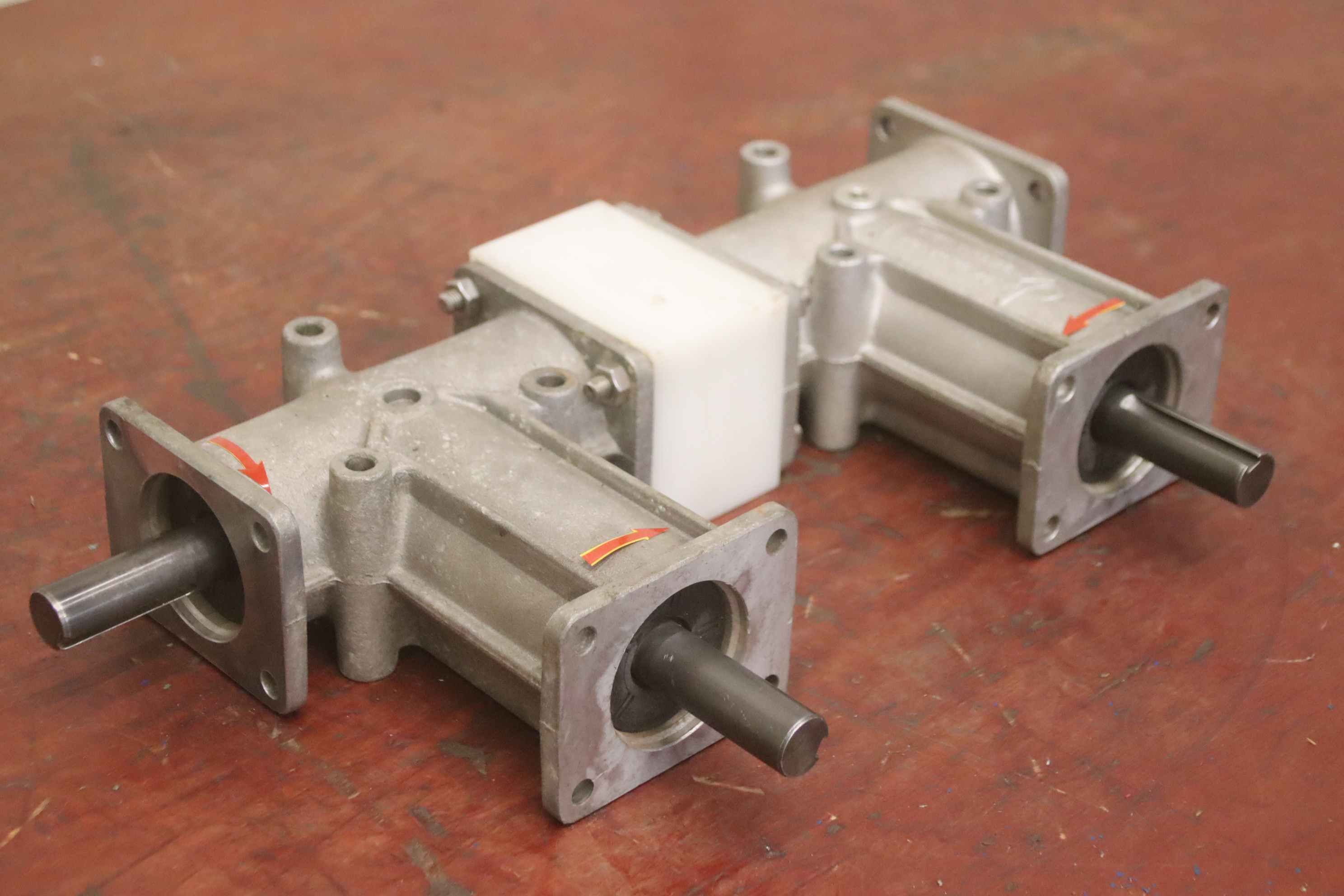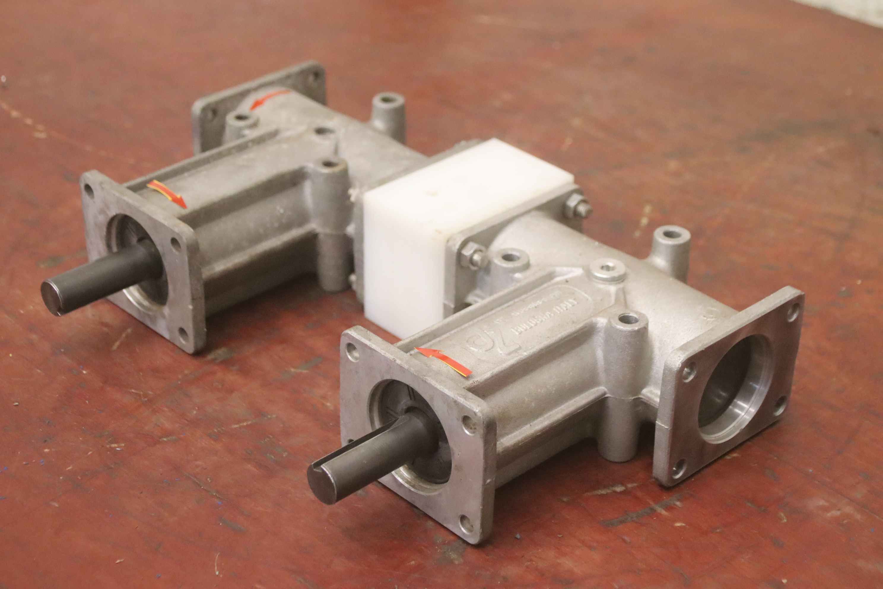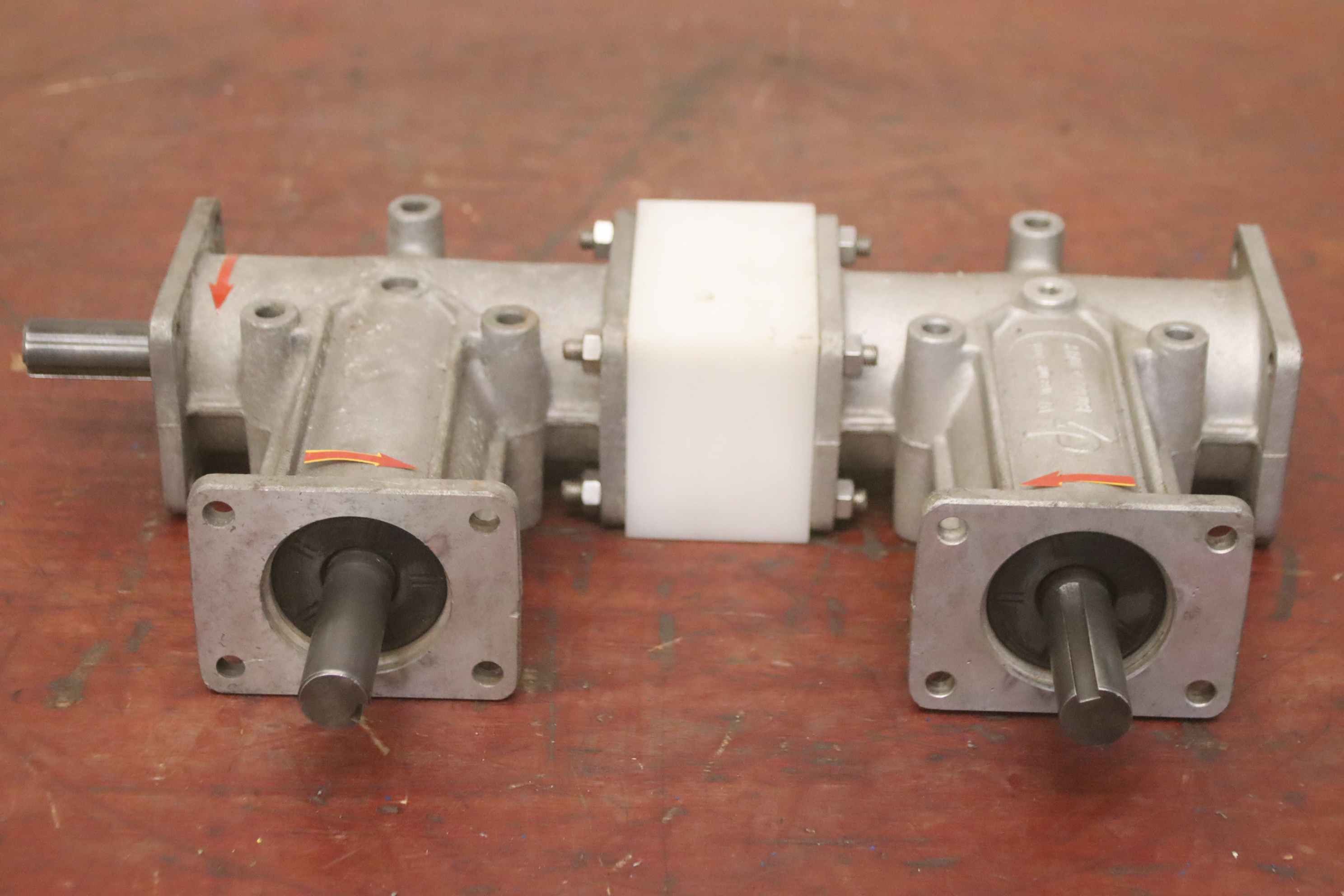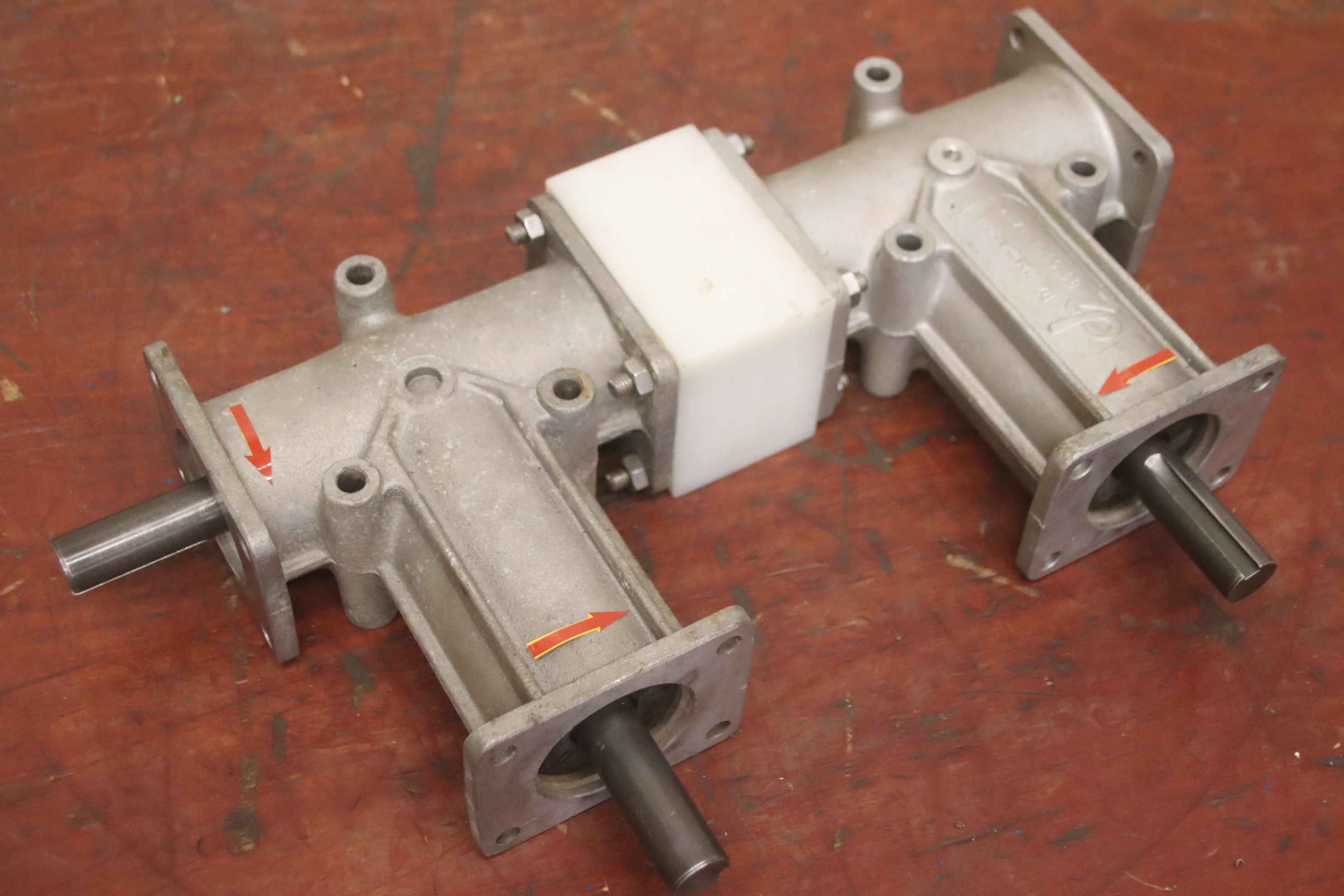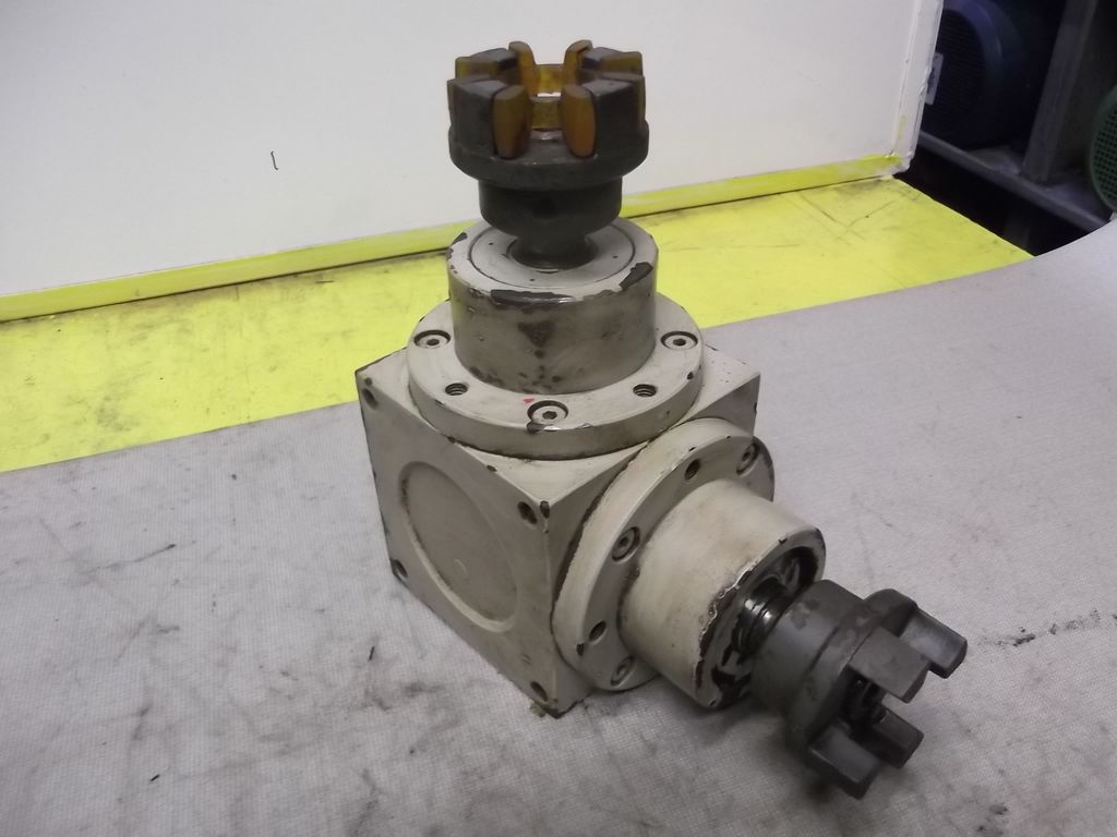 Gearbox, bevel gear, worm gear-Manufacturer: DZ transmissioni, double bevel gear-Translation: i = 1:1-Shafts: Ø 20 x 50 mm-Rotation direction: counter-rotating, see photo-Dimensions: 410/240/H75 mm-Weight: 7.5 kg