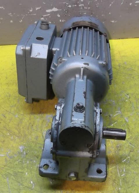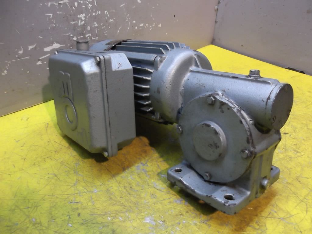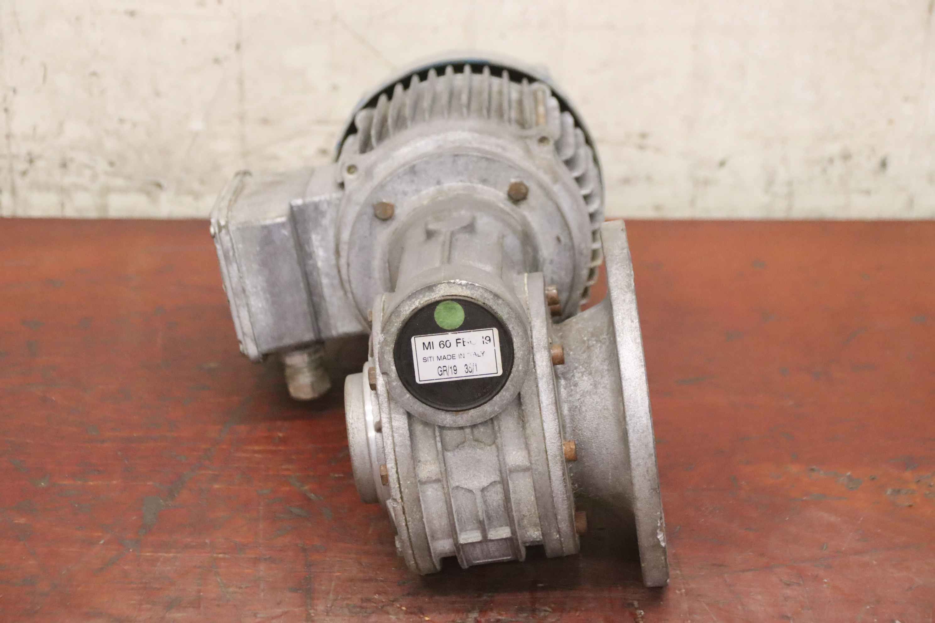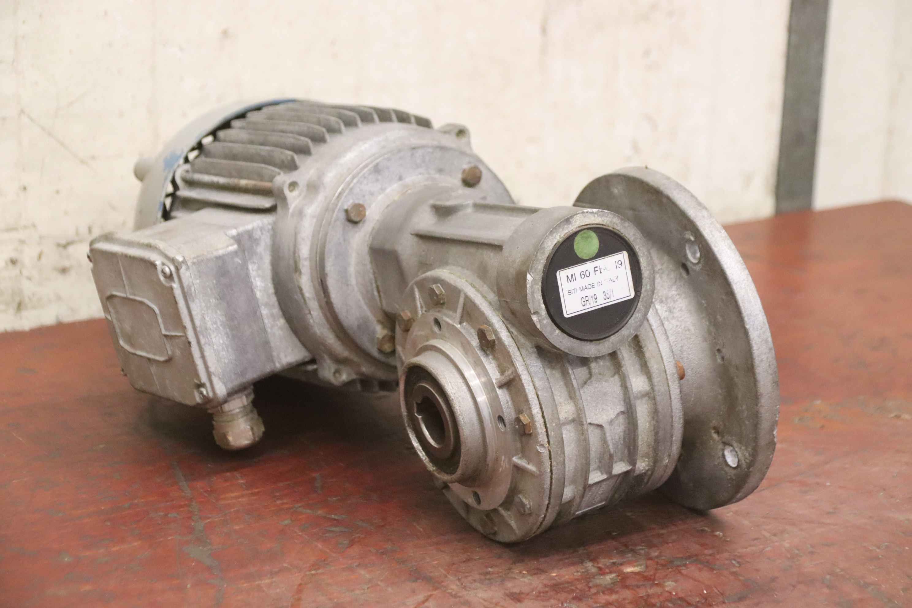 gear motor, electric motor, three-phase motor, electric gear motor-Manufacturer gearbox: SITI, worm gear type MI 60 F GR/19 38/1-Speed speeds: approx. 30 rpm i= 45:1-Engine manufacturer: Lafert Type ST 80/4-Power: 0.52 kW-Protection class: IP55-Hollow shaft: Ø 25 x 120 mm-Dimensions: 420/220/H200 mm-Weight: 17.4 kg