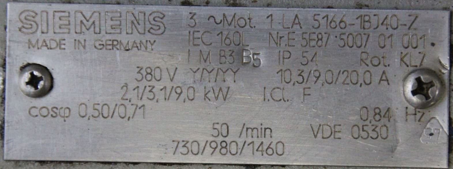 Electric motor, three-phase motor-Manufacturer: Siemens-Type: 1LA5166-1BJ40-Z IEC160L-Power: 2.1/3.1/9 kW-Speeds: 730/980/1460 rpm-Shaft: Ø 42 mm-Construction: B3B5-Protection class: IP 54-Number: 2x motors available-Price: per piece-Dimensions: 640/355/H360 mm-Weight: 97 kg