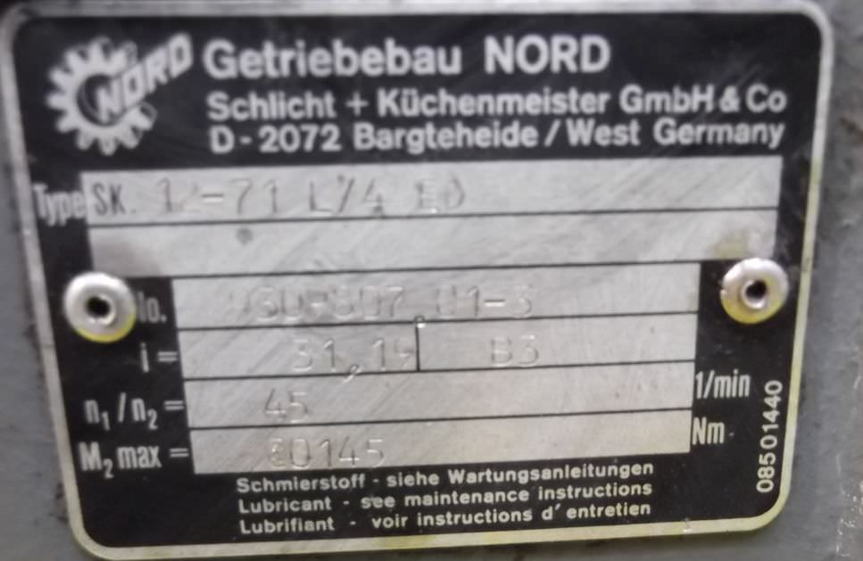 Adjustable geared motor, variable speed geared motor, electric motor -Motor manufacturer Emod Type: EEDF71L/4 -Transmission manufacturer Nord Type: SK12-71L/4E -Motor power: 0.37 kW -Speed: 45 rpm -Design: B3 -Drive shaft: Ø 25 mm -Protection class: IP 54 -Dimensions: -Weight: 17.4 kg