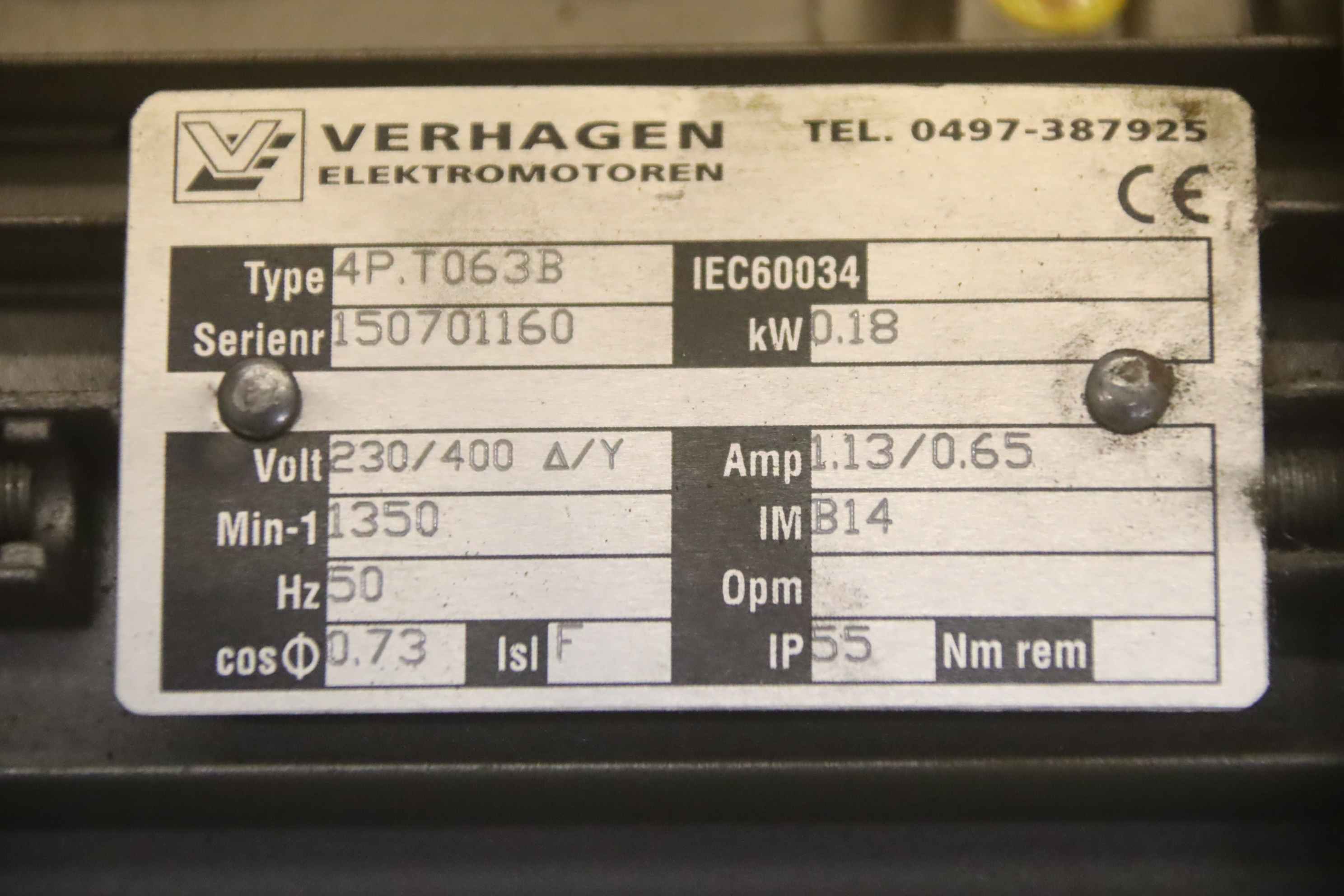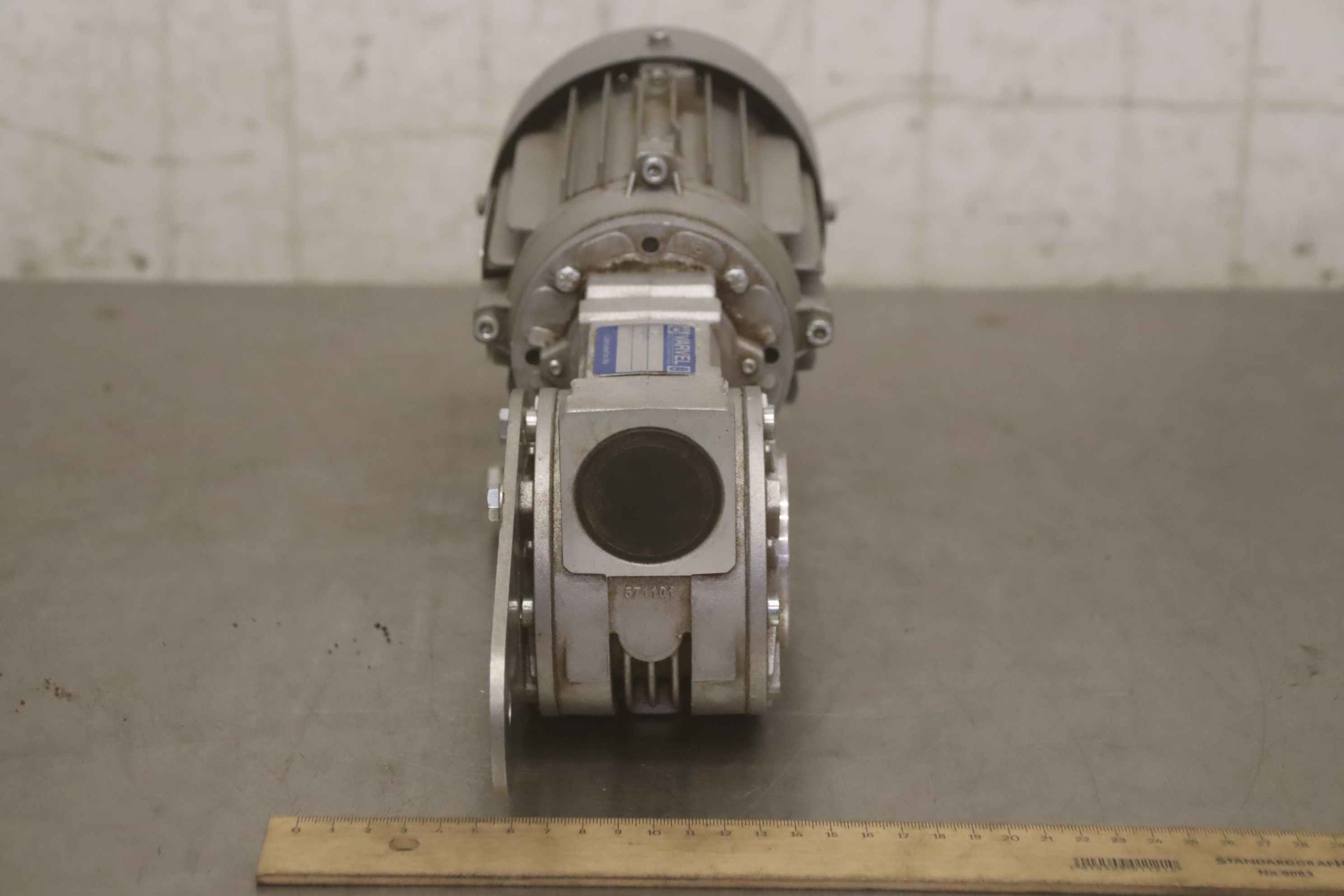 Geared motor, electric motor, three-phase motor, electric geared motor -Manufacturer: Varvel, geared motor -Type: FRS40/PC 19MM i=10 IEC63B14 -Speed: 135 rpm -Motor: Verhagen type 4P.T063B 0.18 kW 1350 rpm -Protection rating: IP55 -Hollow shaft: Ø 19 x 80 mm -Design: B14 -Dimensions: 385/122/H165 mm -Weight: 6.2 kg
