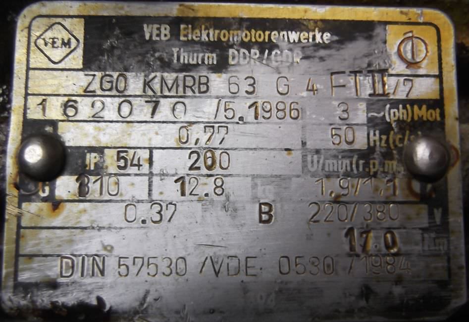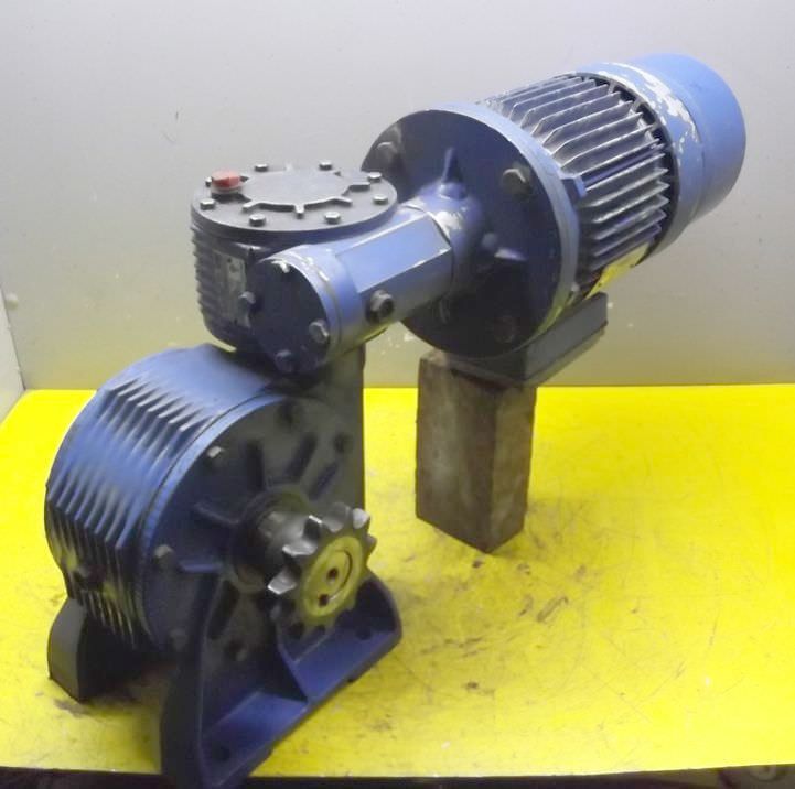 Gear motor, electric motor, three-phase motor, electric gear motor-Engine manufacturer: MGM-Gearbox manufacturer: MGM-Speed: 3.25/15 rpm-Power: 0.45/1.3 kW-Construction: B3 angle-Diameter shaft: 38 mm-Protection class: IP 44-Number: 2x motors available-Price: per piece-Dimensions: 700/300/H440 mm-Weight: 64 kg