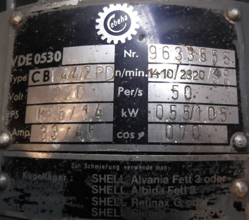 Gear motor, electric motor-Speed: 45/90 rpm-Power: 0.55/1.05 kW-Construction: B3-Diameter shaft: Ø 25 mm-Protection class:-Number: 1x motors available-Price: per piece-Dimensions: 440/220/H220 mm-Weight: 25 kg