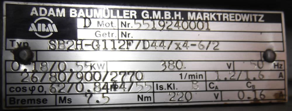 DC, geared motor -Power: 3 kW -DC motor: Manufacturer Baumüller, type DSG -Speed: 6000 rpm -Transmission: Manufacturer Nord Type 2282AZ-IEC 80 -Translation: 1:11,81 -Hollow shaft diameter: 35 mm -Speedometer: Manufacturer Stegmann Type DG 60L XSR 500 Pulse/REV -Dimensions: 690/340/H200 mm -Weight: 50 kg