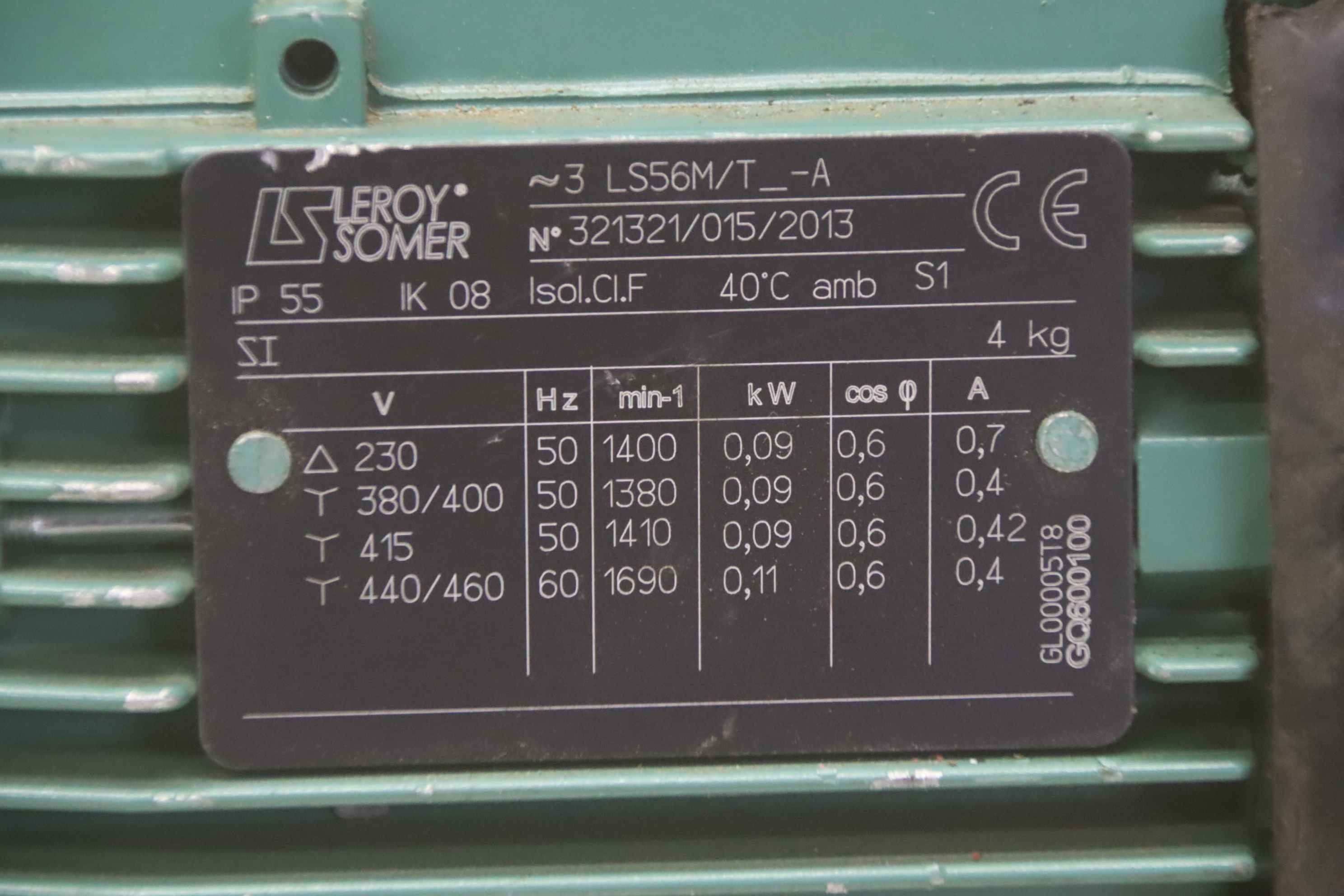 Geared motor, electric motor, three-phase motor, electric geared motor -Manufacturer: Varvel, 2-speed geared motor -Transmission: Type: SXA063801114 i=8 / SRS04028G319 i=28 -Speed: 7 rpm -Motor: Leroy Somer 0.09 kW -Voltage: 230 V 1400 RPM / 380/400 V 1380 RPM -Protection rating: IP55 -Shaft: Ø 19 x 28 mm -Design: B3 -Dimensions: 355/130/H165 mm -Weight: 7.4 kg