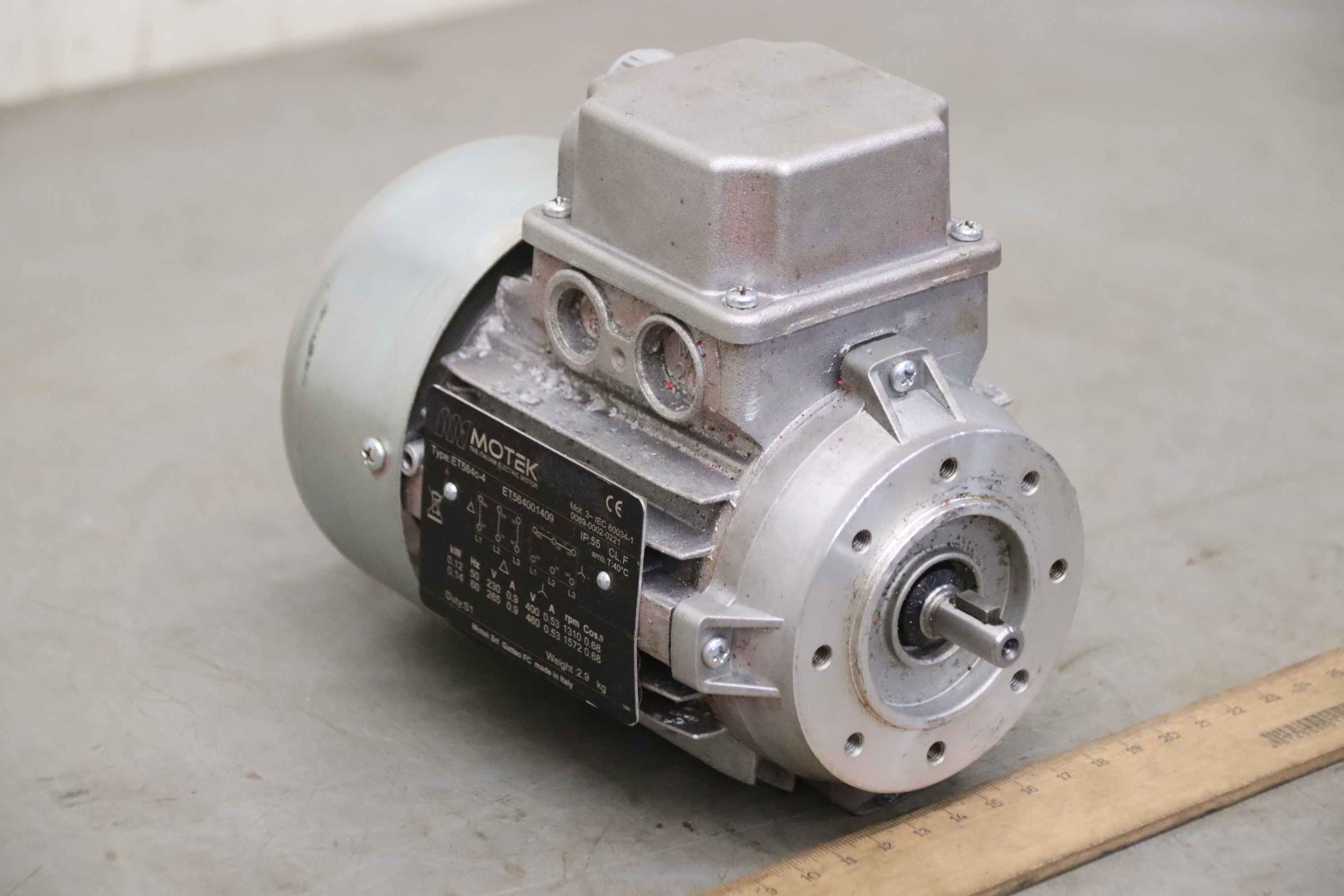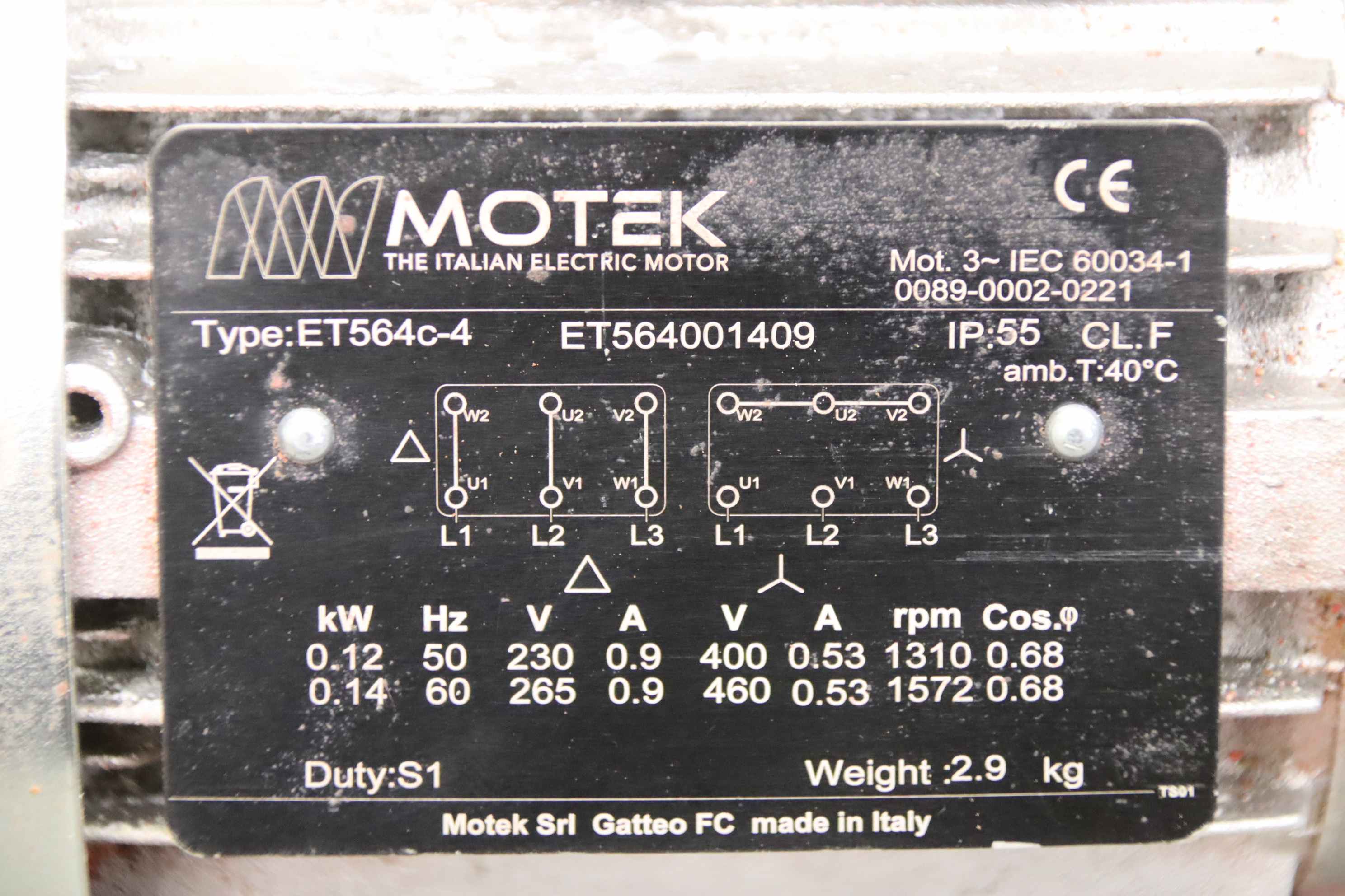electric motor, three-phase motor -Manufacturer: Motek, electric motor type ET564c-4 -Power: 0.12 kW -Speed: 1310 rpm -Shaft: Ø 9 x 20 mm -Design: B14 -Protection class: IP 55 -Dimensions: 190/110/H150 mm -Weight: 3 kg