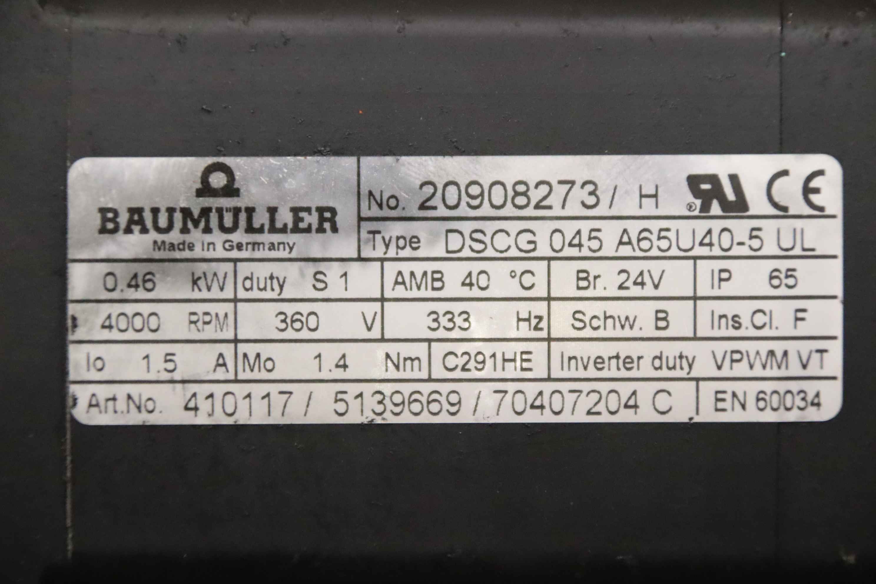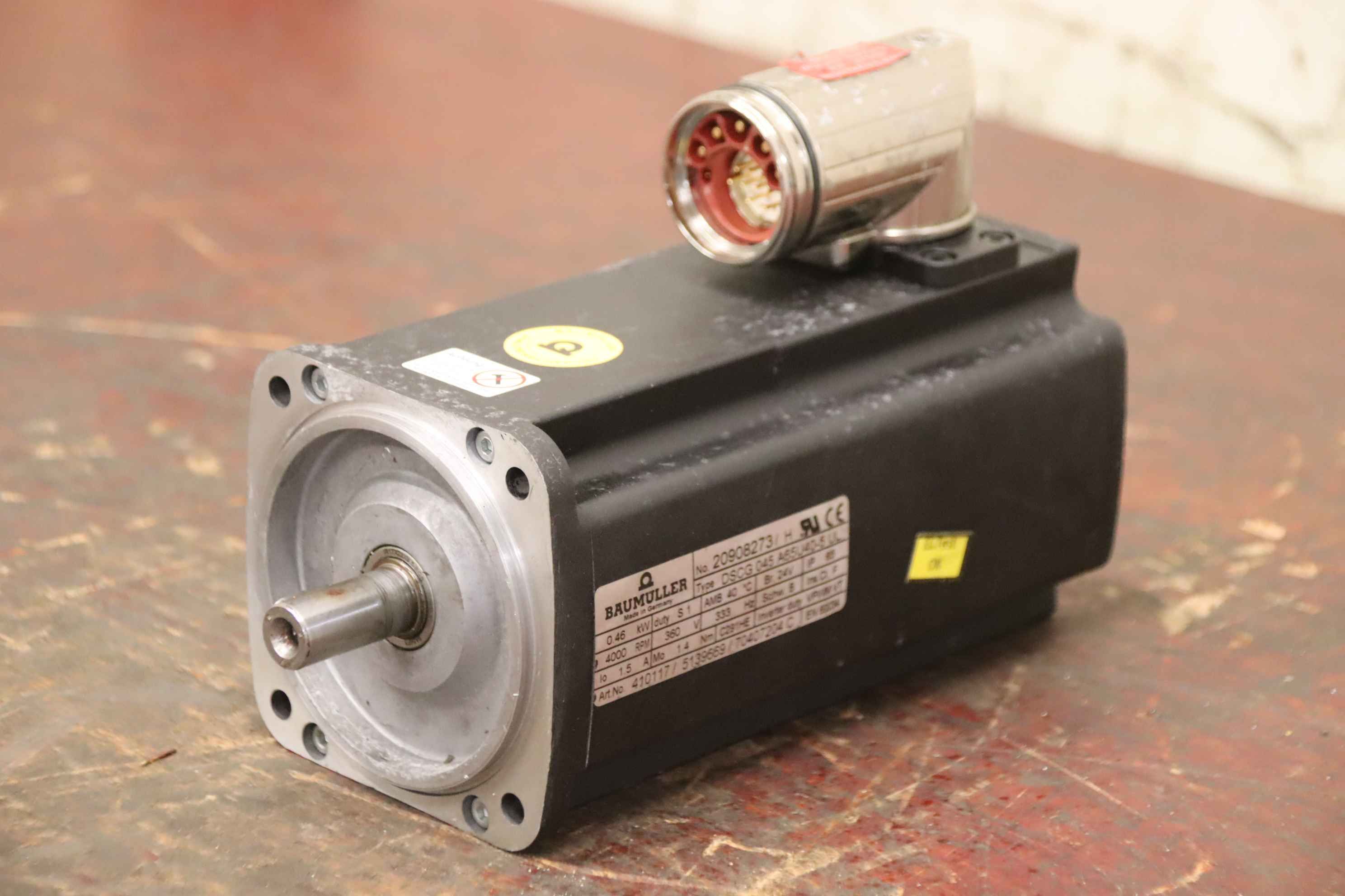Permanent Magnet Motor, Permanent Magnet Motor, Electric Motor, Perm.Magn-Mot, Perm Magnet Motors, Servo Motor, Spindle Motor, Permanent Magnet Three-Phase Servo Motor, AC Spindle Motor-Manufacturer: Baumüller, servo motor with brake-Type: DSCG 045 A65U40-5 UL-Power: 0.46 kW-Speed: 4000 rpm-Technical data: see photo type plate-Shaft: Ø 14 x 30 mm-Number: 3 motors available-Price: per piece-Dimensions: 215/94/H135 mm-Weight: 3.6 kg/piece