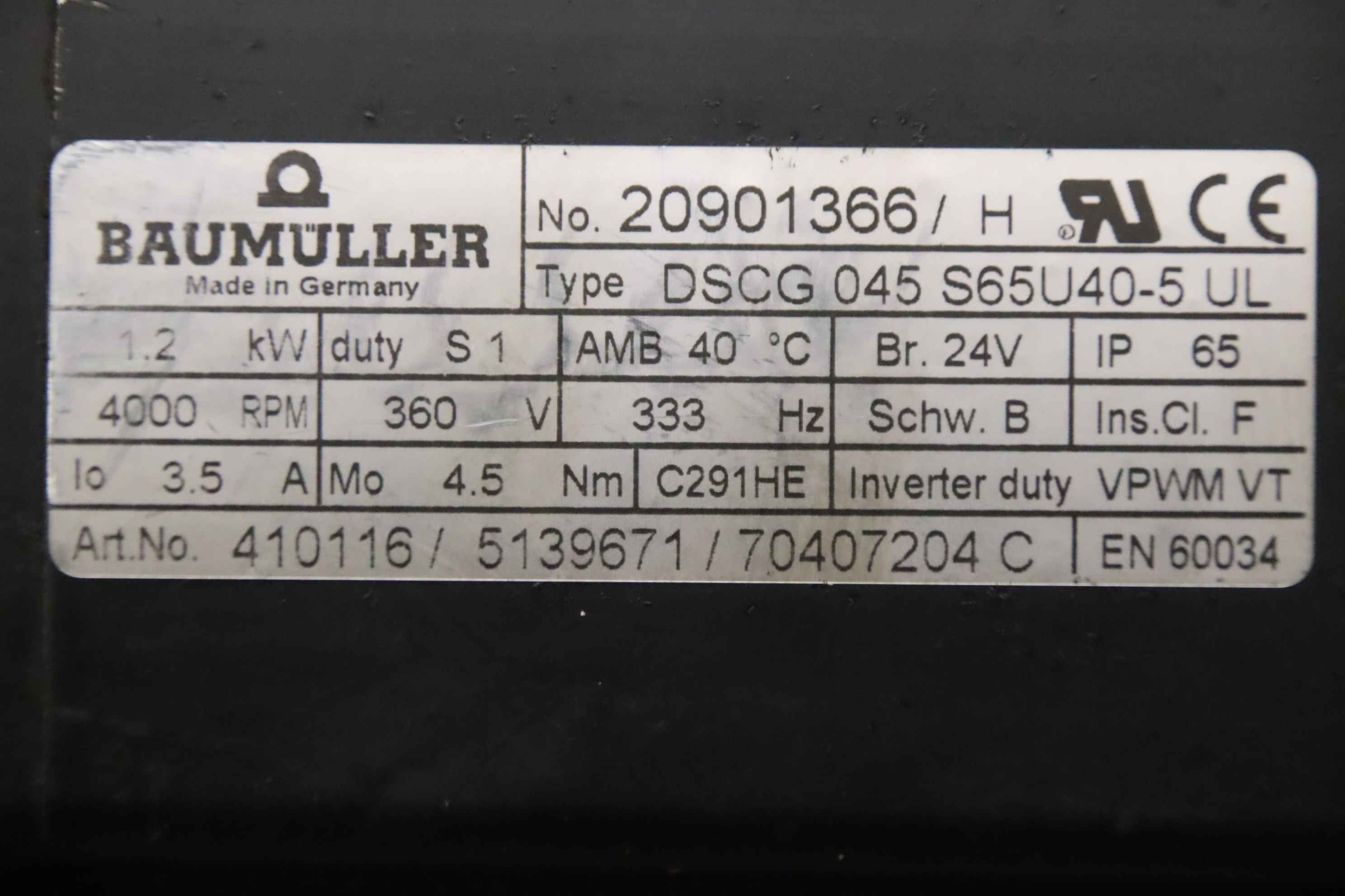 Permanent Magnet Motor, Permanent Magnet Motor, Electric Motor, Perm.Magn-Mot, Perm Magnet Motors, Servo Motor, Spindle Motor, Permanent Magnet Three-Phase Servo Motor, AC Spindle Motor-Manufacturer: Baumüller, servo motor with brake-Type: DSCG 045 S65U40-5 UL-Power: 1.2 kW-Speed: 4000 rpm-Technical data: see photo type plate-Shaft: Ø 14 x 30 mm-Number: 2 motors available-Price: per piece-Dimensions: 255/93/H140 mm-Weight: 5.3 kg/piece