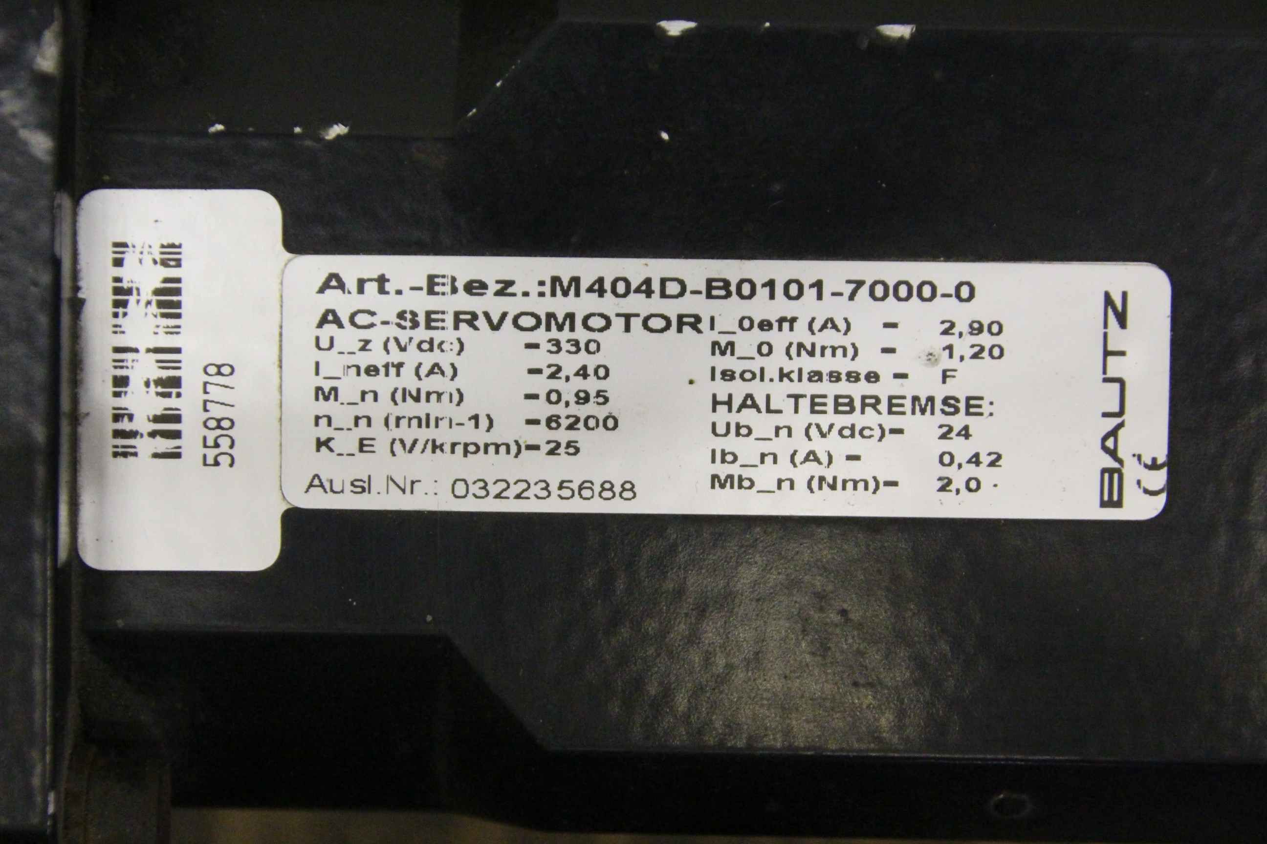 Servo motor, gear motor, electric motor, three-phase motor -Manufacturer engine: Bautz type M404D-B0101-7000-0 -Voltage: 330 V. -Torque: 0.95 Nm -Speed: 6200 rpm -Holding brake: 2 Nm -Manufacturer gearbox: Neugart WPLE 60 -Translation: i = 3 -Shaft: Ø 14 x 30 mm -Design: B14/angle -Dimensions: 260/165/H105 mm -Weight: 5.2 kg