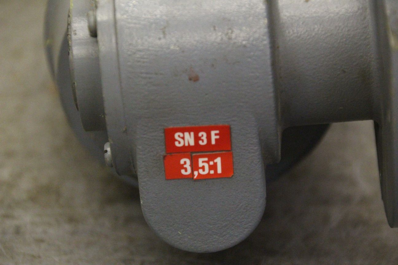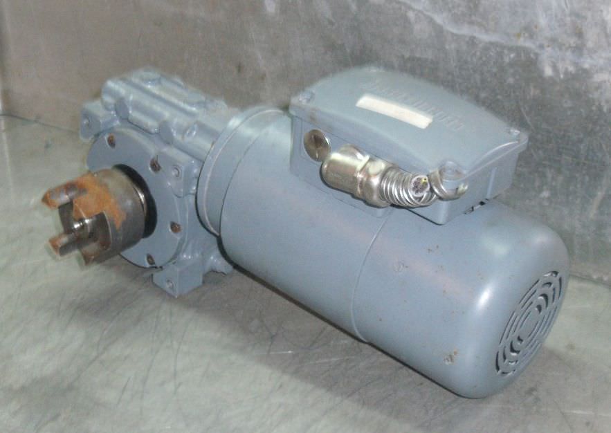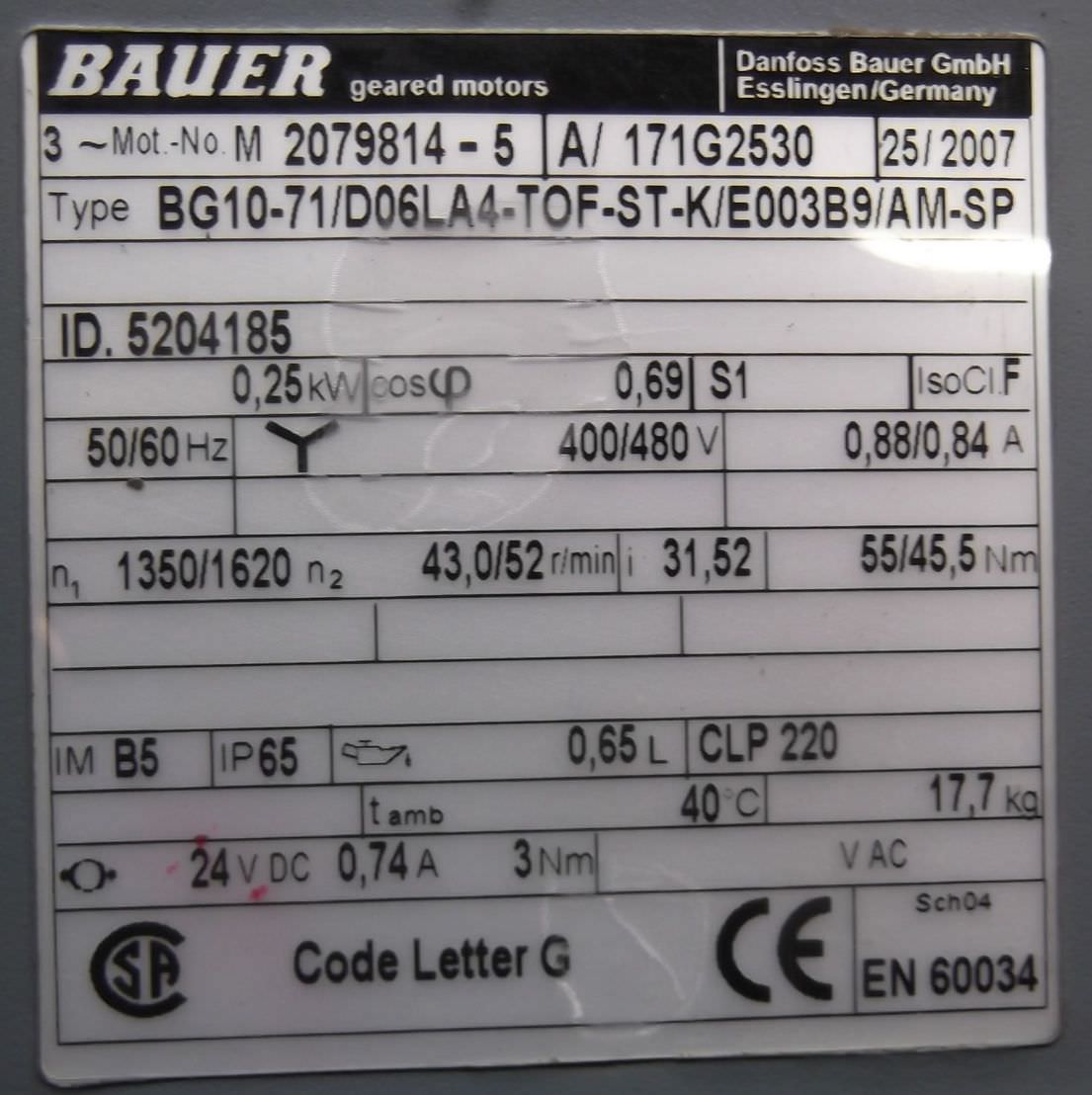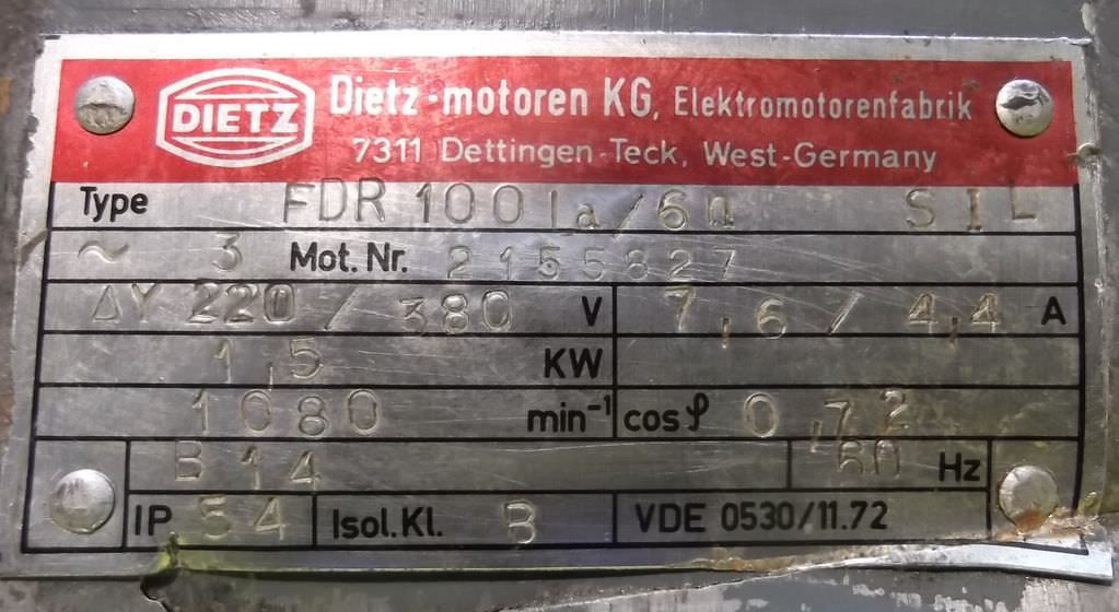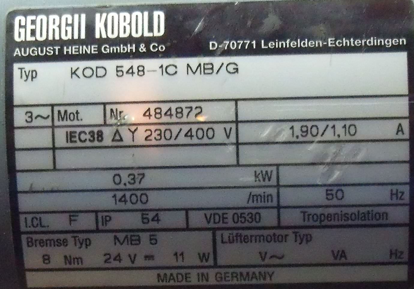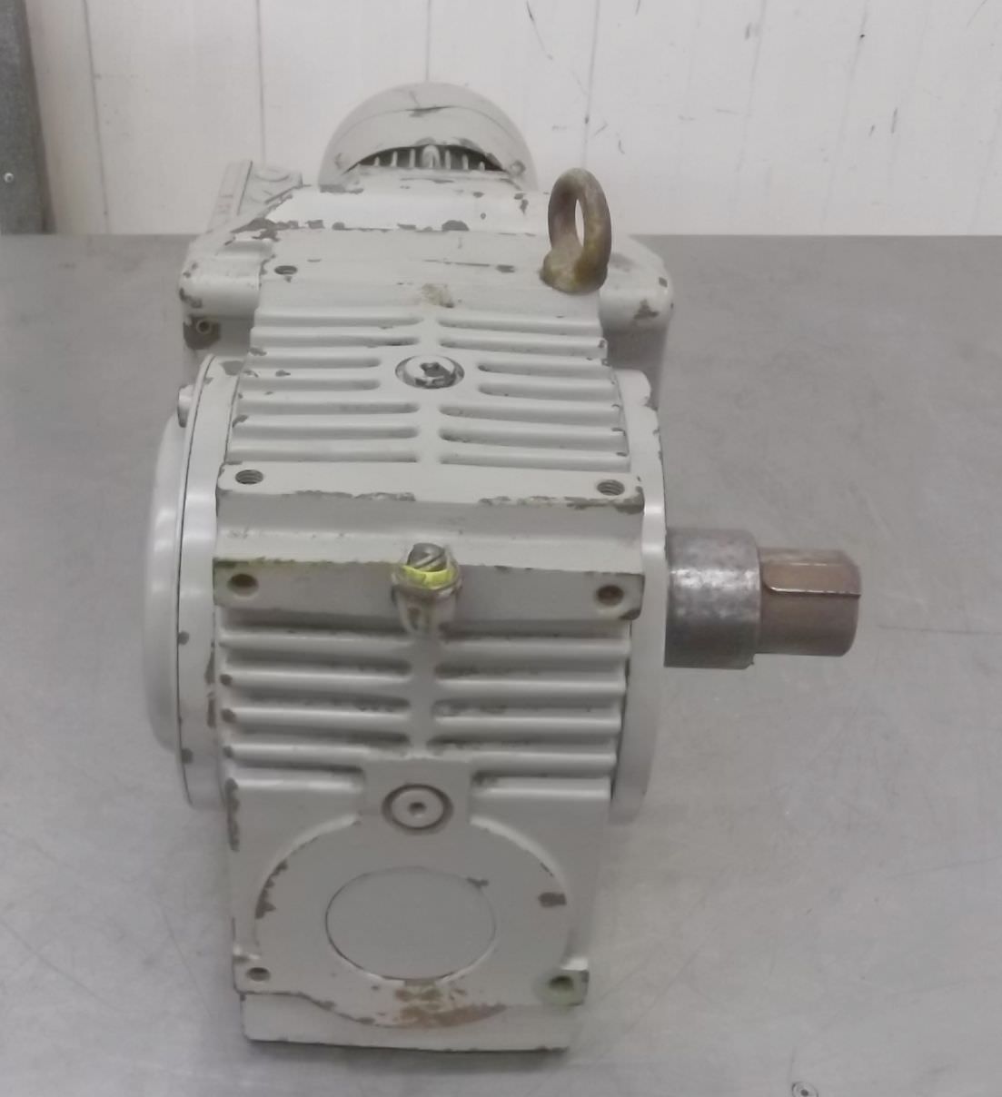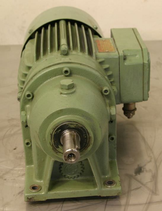 geared motor, electric motor -Speed: 61 rpm -Power: 0.37 kW -Design: B14 angle -Shaft diameter: Ø 24 mm -Brake: 24 V -Protection class: Tropical resistant -Weight: 15 kg