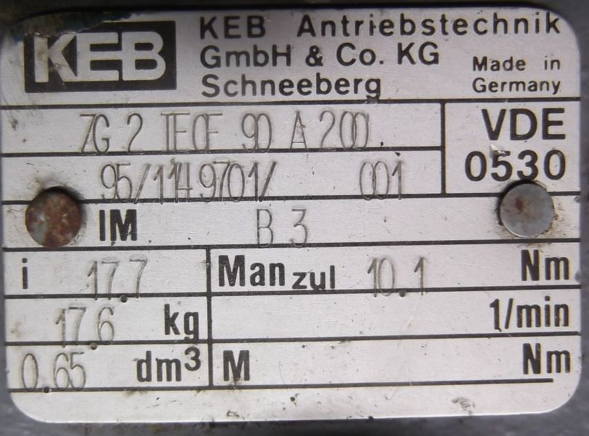 Geared motor, electric motor, electric geared motor -Geared motor: with electric clutch -Engine VEM Type: KPER 90 L 4 -KEB gearbox type: ZG2IE0F90A200 -Speed: 79 rpm -Power: 1.5 kW -Design: B3 -Shaft: Ø 32 mm -Protection class: IP 55 -Quantity: 1 available -Price: per piece -Dimensions: 815/210/H260 mm -Weight: 53 kg