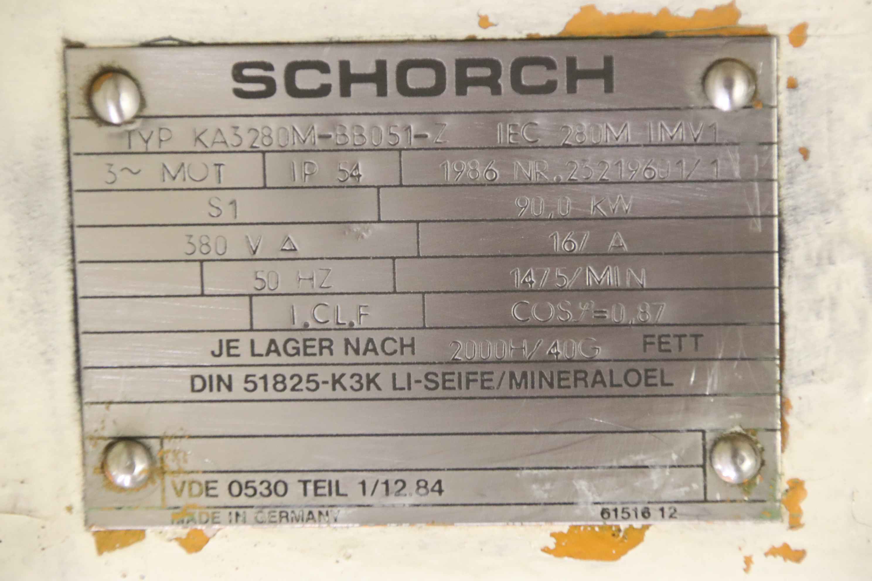 electric motor, three-phase motor -Manufacturer: Schorch, electric motor type KA3280M-BB051-Z -Power: 90 kW -Speed: 1475 rpm -Shaft: Ø 75 x 140 mm -Design: B5 -Protection class: IP 54 -Dimensions: 1050/700/H550 mm -Weight: 692 kg