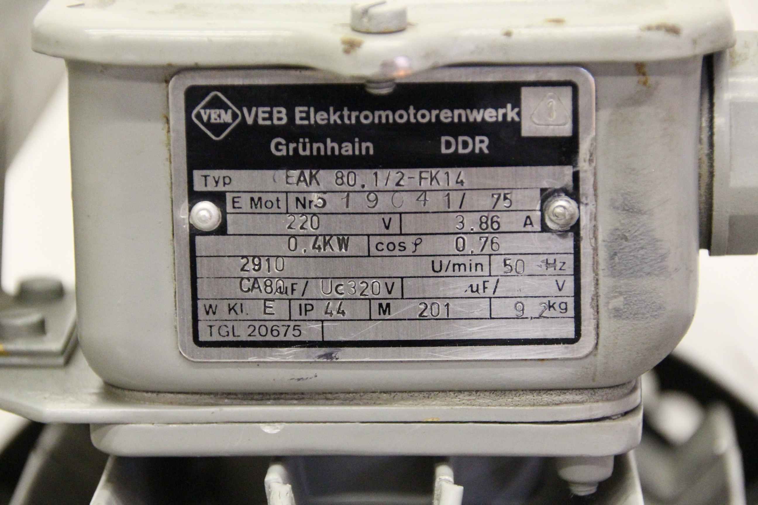 Electric motor, three-phase motor-Manufacturer: VEM, electric motor type EAK 80.1/2-FK14-Power: 0.4 kW-Speed: 2910 rpm-Shaft: Ø 19 mm-Construction: B3-Number: 3x motor available-Price: per piece-Dimensions: 300/180/H210 mm-Weight: 9.5 kg/pc.