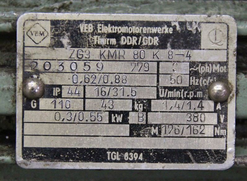 Gear motor, electric motor, three-phase motor, electric gear motor-Speed: 16/31.5 rpm-Power: 0.3/0.55 kW-Construction: B3-Shaft: Ø 48 x 110 mm-Protection class: IP 44-Number: 1x available-Price: per piece-Dimensions: 580/250/H270 mm-Weight: 43 kg