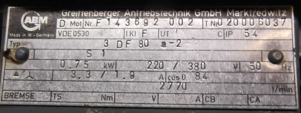 electric motor, three-phase motor -Power: 0.37 kW -Speed: 1400 rpm -Shaft diameter: 14 mm -Brake -Design: B5 -Protection class: IP 54 -Weight: 12 kg
