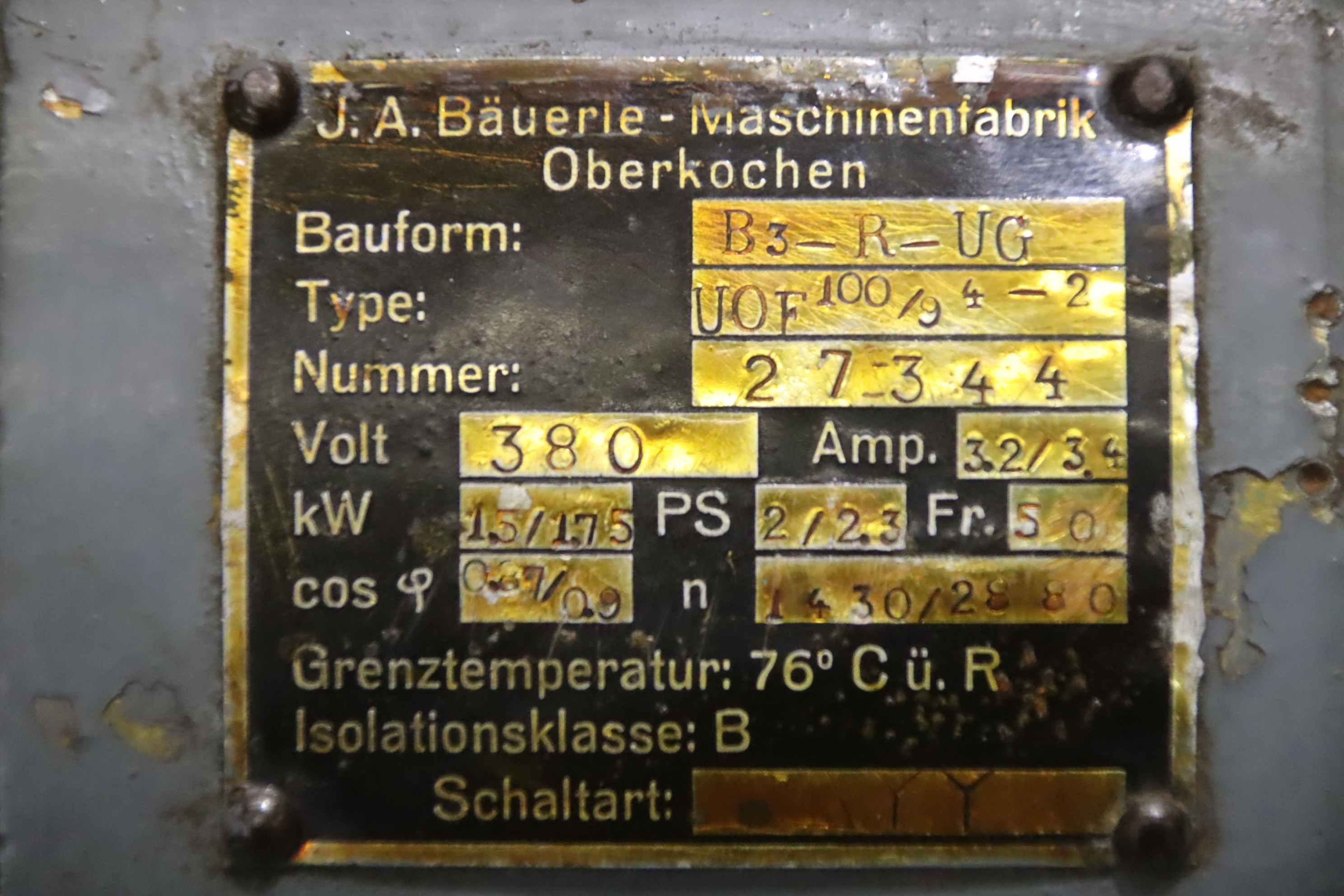 Electric motor, three-phase motor-Manufacturer: Bäuerle, electric motor type UOF100/94-2-Power: 1.5/1.75 kW-Speed: 1430/2880 rpm-Shaft: Ø 22 x 60 mm-Construction: B3-Dimensions: 345/270/H225 mm-Weight: 25 kg