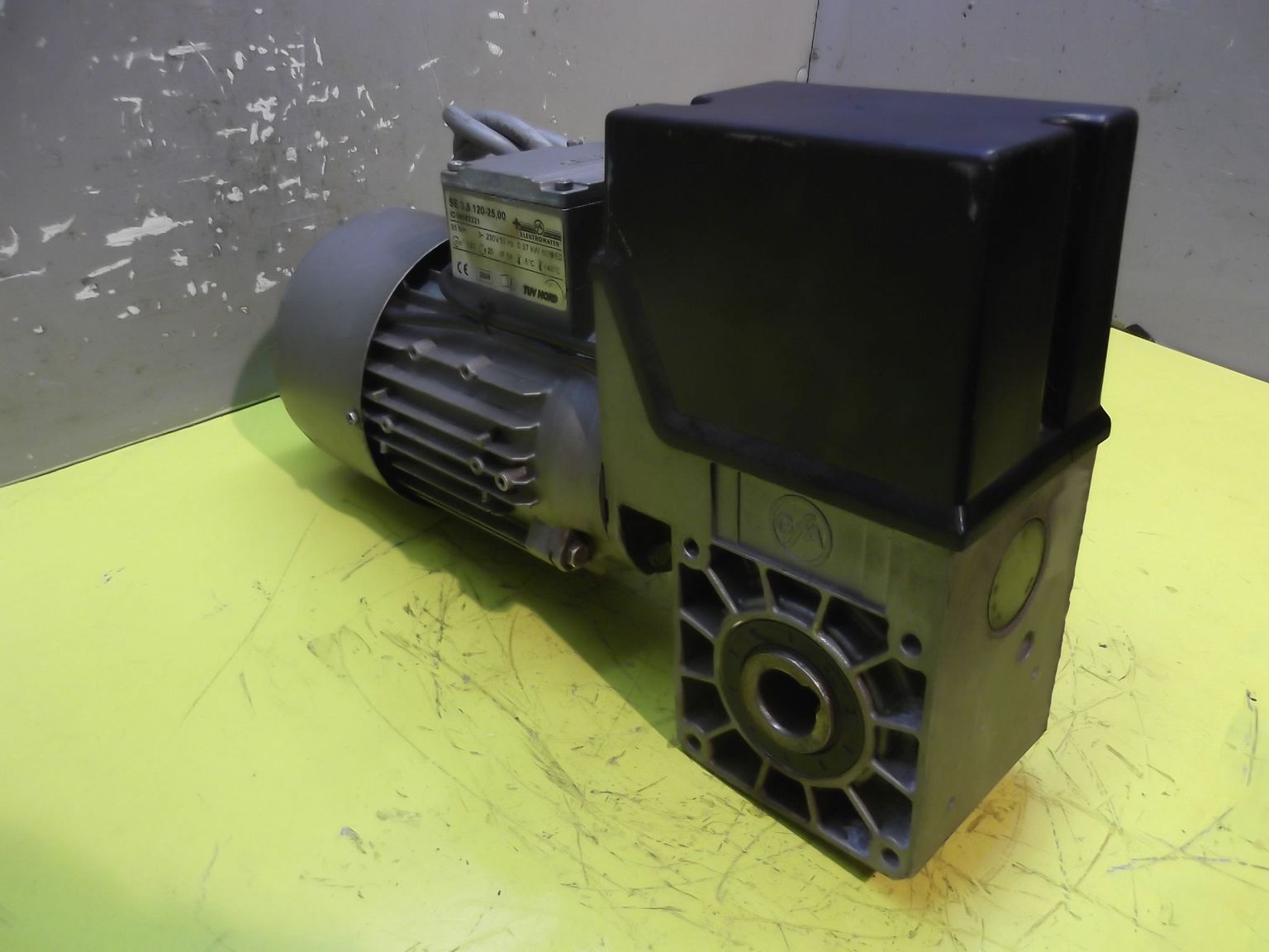 Gear motor, electric motor, three-phase motor, door drive, roller door drive, sectional door drive, electric gear motor, electromat -Manufacturer: GfA, Elektromat type SE 3.5.120-25.00 -Speed: 120 rpm -Motor: Siemens, power 0.37 kW -Shaft: Ø 25 mm -Protection class: IP 55 -Dimensions: 375/140/H245 mm -Weight. 12 kg