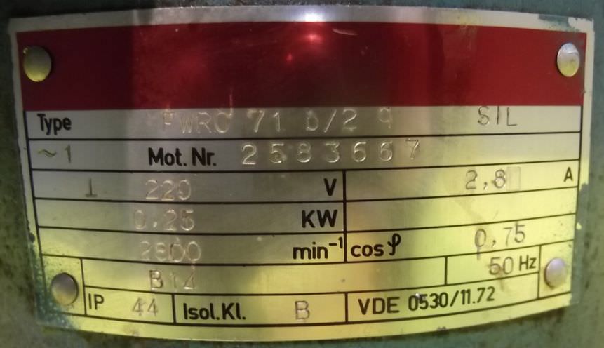 electric motor -Power: 0.25 kW -Speed: 2800 rpm -Brake: 220 V -Shaft diameter: 14 mm -Design: B14 -Protection class: IP 44 -Dimensions: 275/140/H176 mm -Weight: 9 kg
