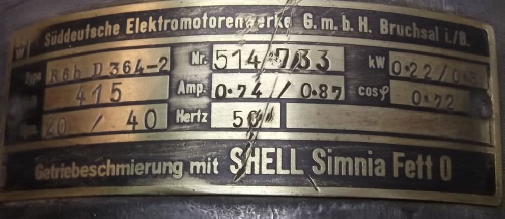 Gear motor, electric motor, electric gear motor-Speed: 20/40 rpm-Power: 0.22/0.3 kW-Construction: B3-Diameter shaft: 30 mm-Protection class:-Number: 5x motors available-Price: per piece-Dimensions:-Weight: 38 kg