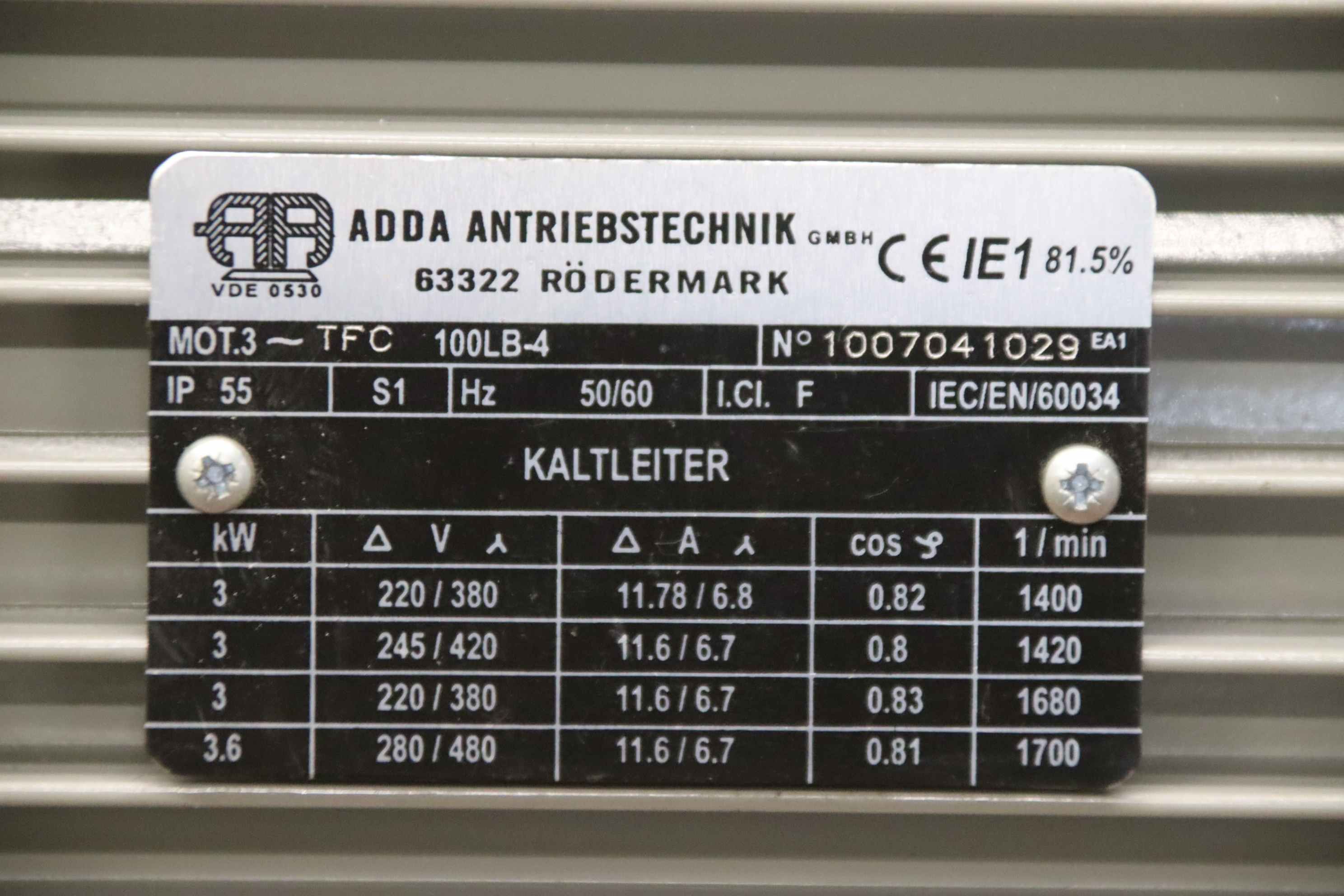 three-phase motor, electric motor-Manufacturer: ADDA, electric motor type 100LB-4-Power: 3 kW-Speed: 1400 rpm-Shaft: Ø 28 x 60 mm-Design: B3/B14-Protection class: IP 55-Dimensions: 360/200/H250 mm-Weight: 22.6 kg