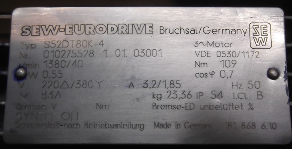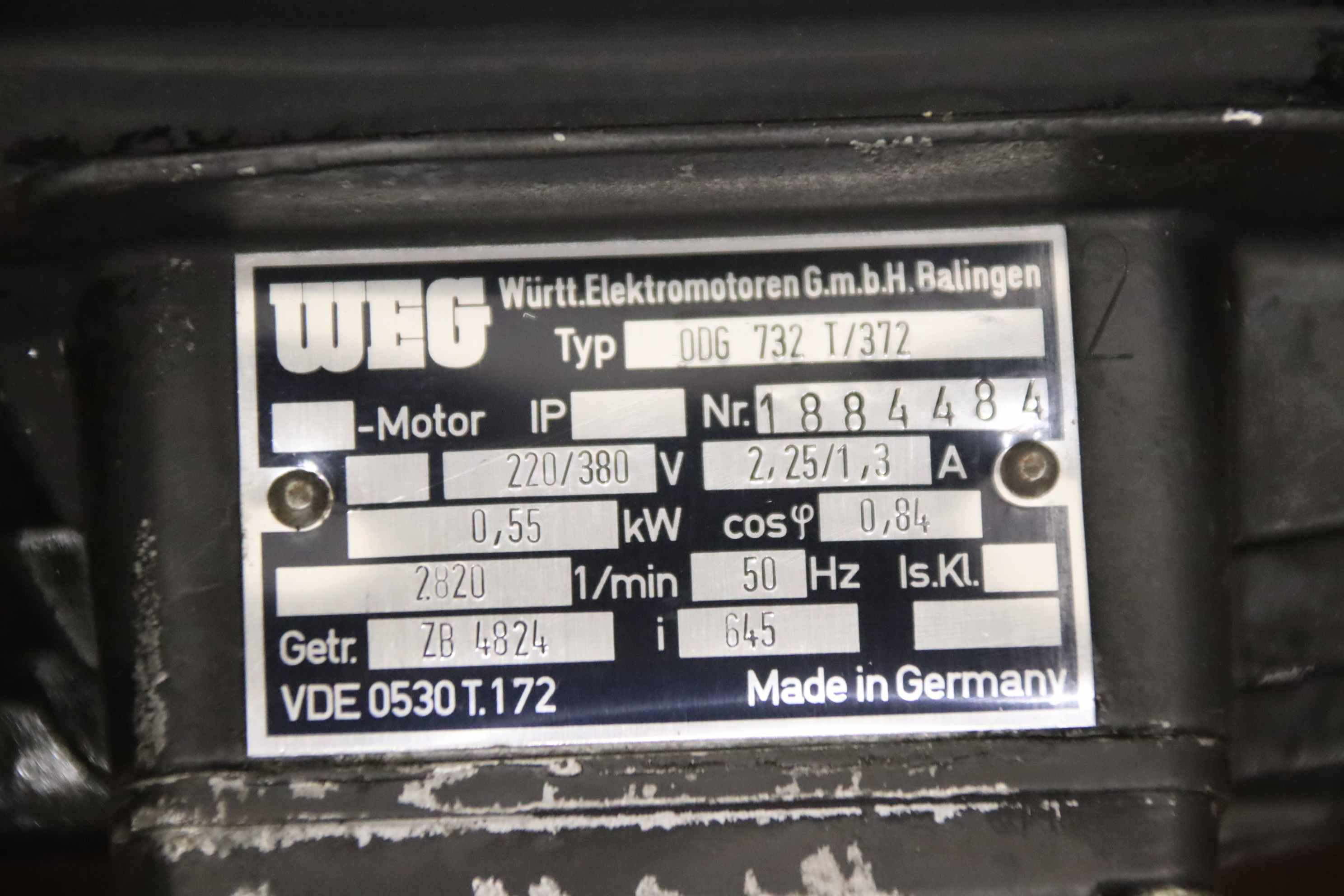Gear motor, electric motor, three-phase motor, feed motor -Manufacturer: Weg, gear motor with attachments -Engine: Type ODG 732 T/372 -Power: 0.55 kW -Gearbox: Type ZB 4824 i= 645 -Drive wheel speed: 30 rpm -Dimensions total: 360/250/H350 mm -Weight: 31.1 kg