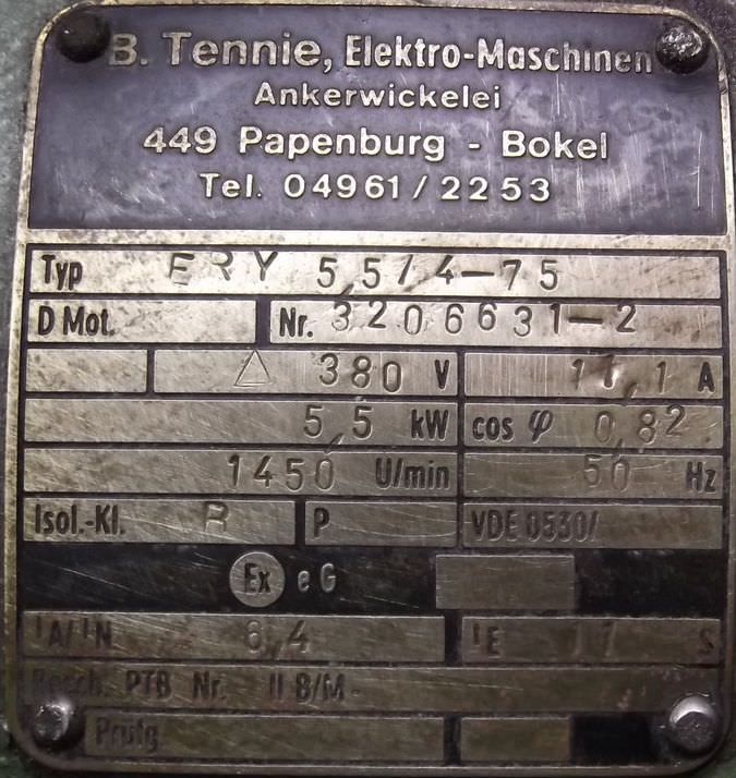 Electric motor, three-phase motor -Power: 5.5 kW -Speed: 1450 rpm -Shaft: Ø 38 mm -Design: B3 -Protection class: IP44 -Quantity: 1 piece available -Dimensions: 440/340/H260 mm -Weight: 56 kg