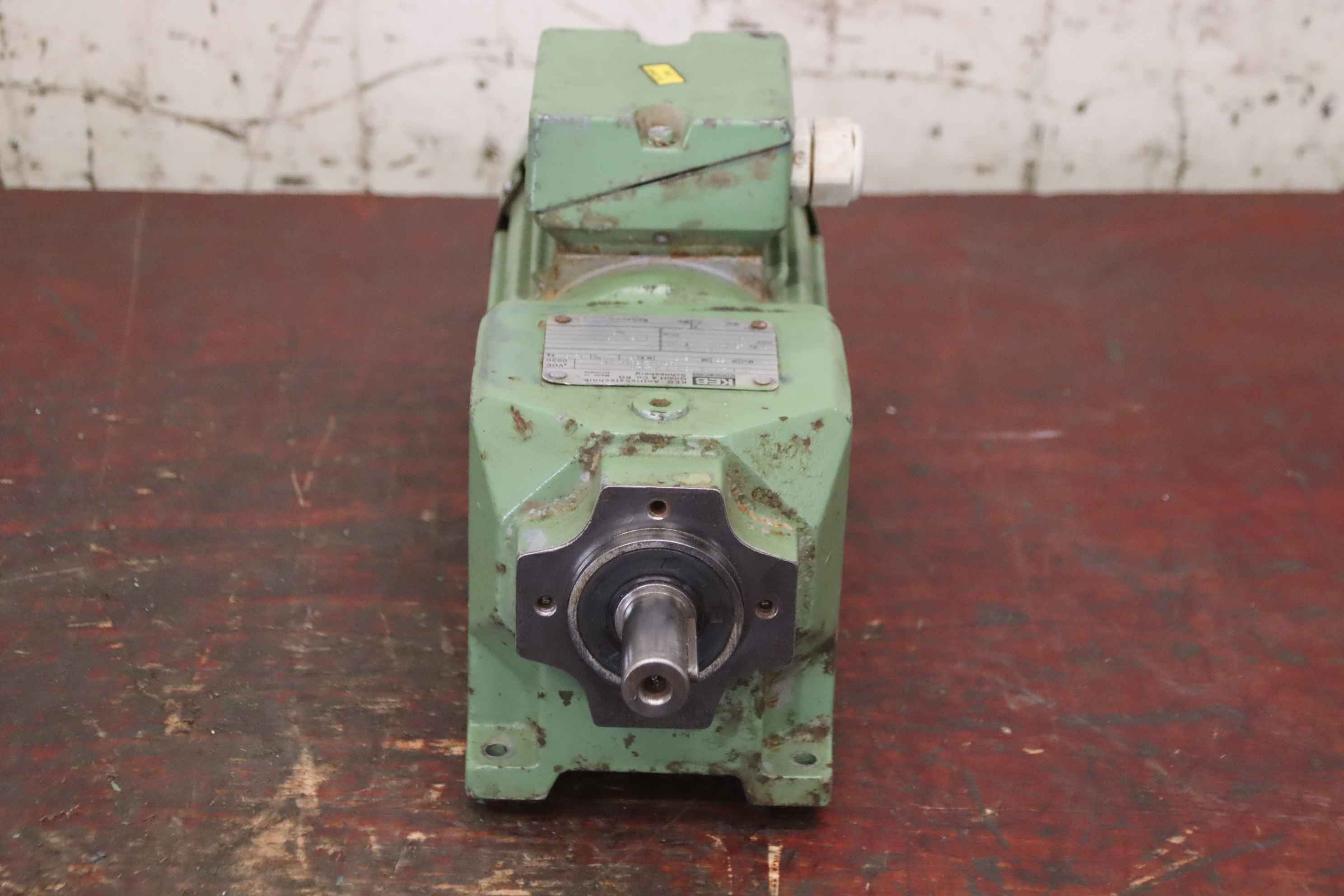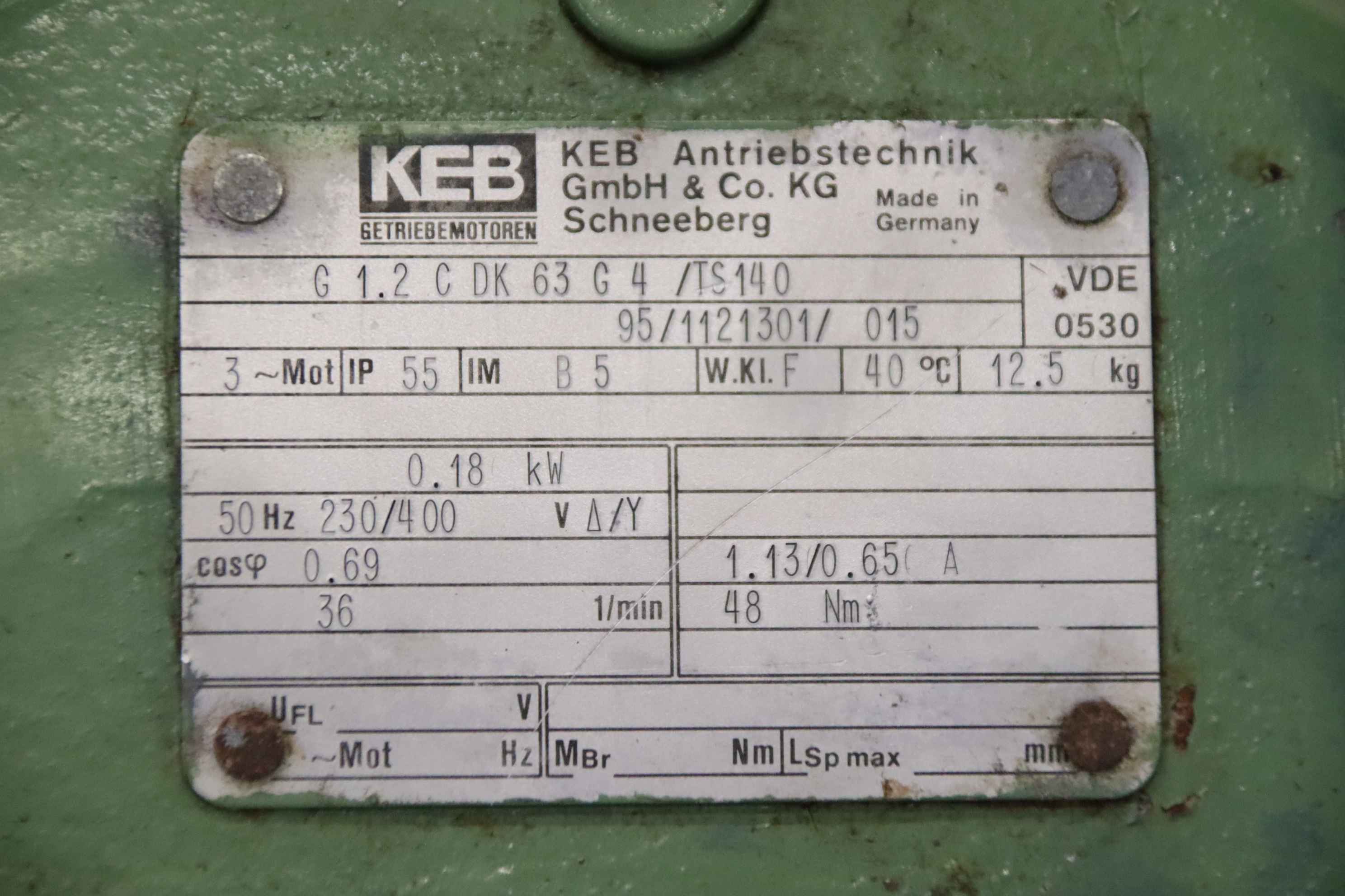 Geared motor, electric motor, electric geared motor, spur geared motor-Manufacturer: KEB, spur gear motor type G 1.2 C DK 63 G 4 /TS140-Speed: 36 rpm-Power: 0.18 kW-Shaft: Ø 20 x 40 mm-Protection class: IP55-Dimensions: 345/125/H185 mm-Weight: 12.3 kg