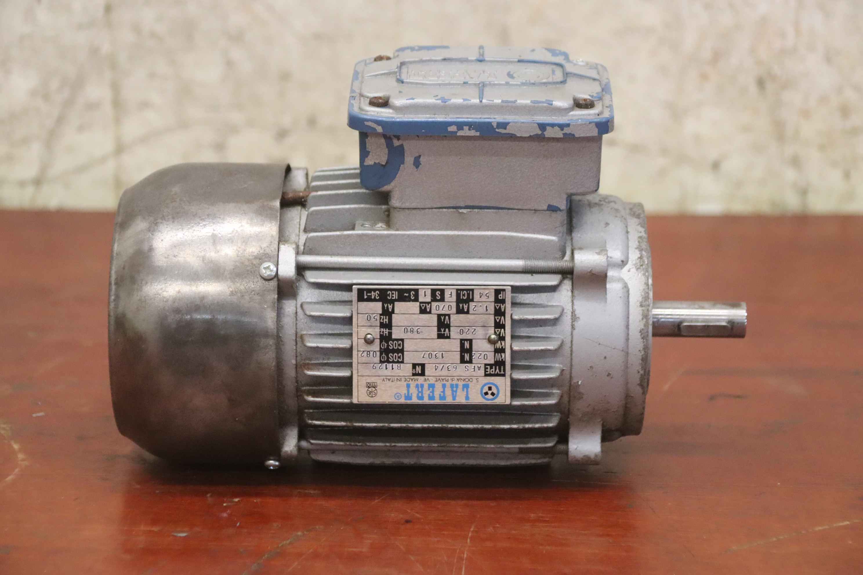 Three-phase motor, electric motor-Manufacturer: Lafert, electric motor type AFS 63/4-Power: 0.22 kW-Speed: 1307 rpm-Shaft: Ø 14 x 40 mm-Design: B14-Protection class: IP 54-Dimensions: 235/116/H160 mm-Weight: 5.4 kg