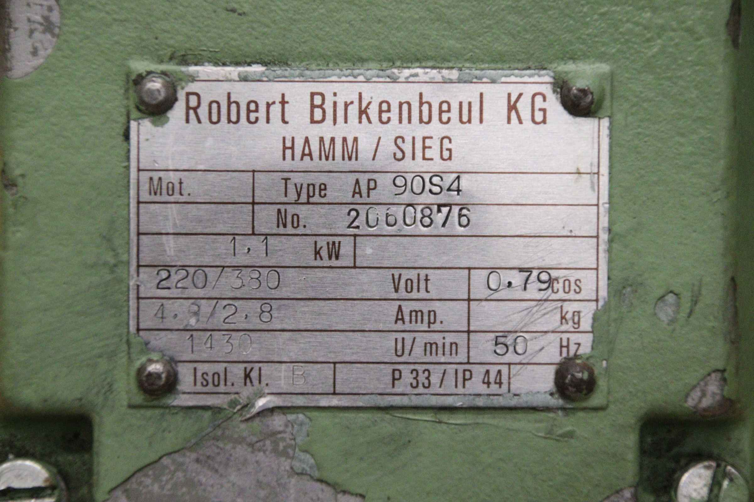 Electric motor, three-phase motor, pulley motor -Manufacturer: Birkenbeul, electric motor Ty AP 90S4 -Power: 1.1 kW -Speed: 1430 rpm -Shaft: Ø 24 x 50 mm -Design: B3 -Protection class: P 33 / IP 44 -Dimensions: 300/265/H180 mm -Weight: 20.7 kg