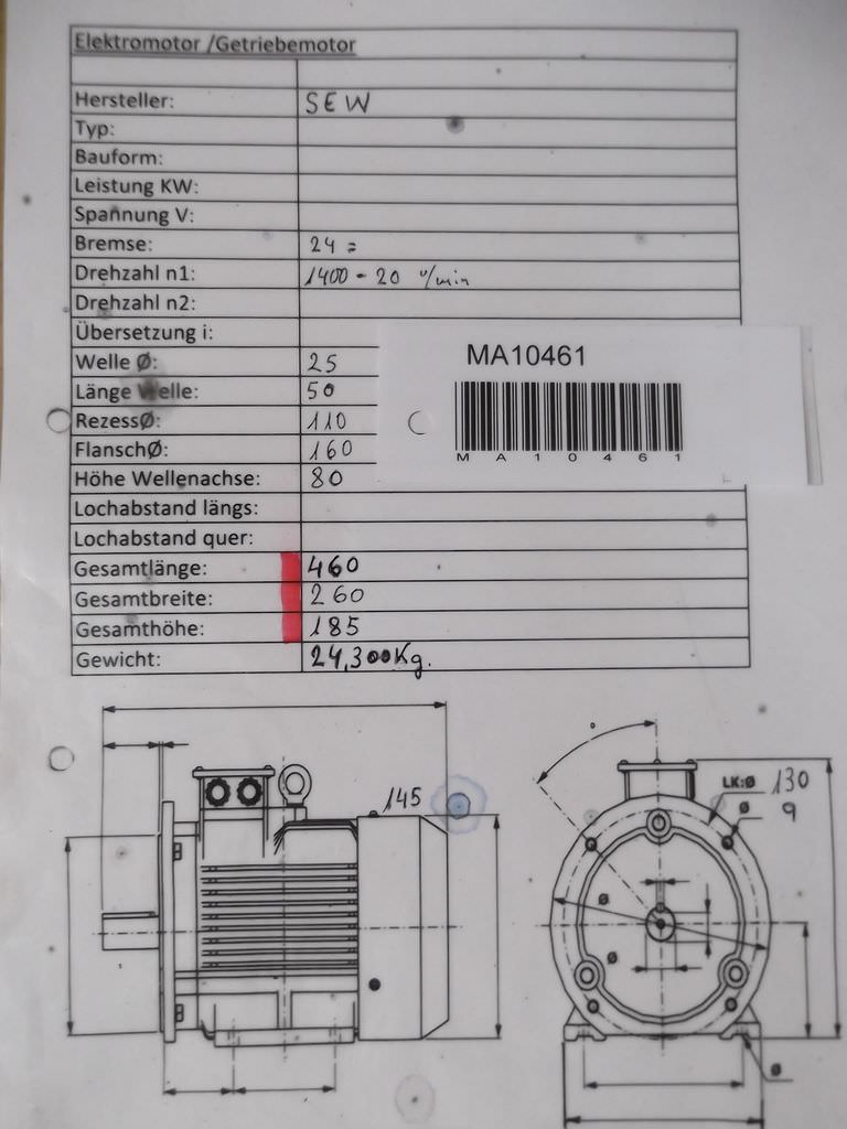 Gear motor, electric motor, electric gear motor-Speed: 20 rpm-Power: 0.25 kW-Diameter shaft: Ø 25 mm-Construction: B5 angle-Protection class: IP 54-Brake-Number: 2x motors available-Price: per piece-Dimensions: 460/270/H190 mm-Weight: 24.3 ...