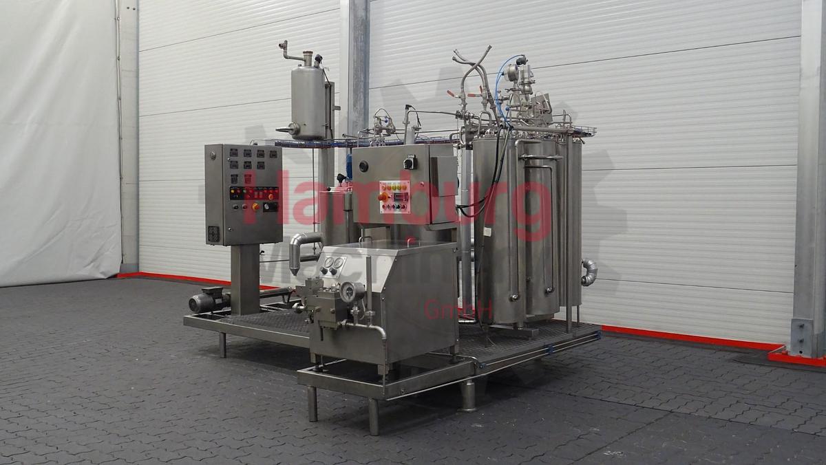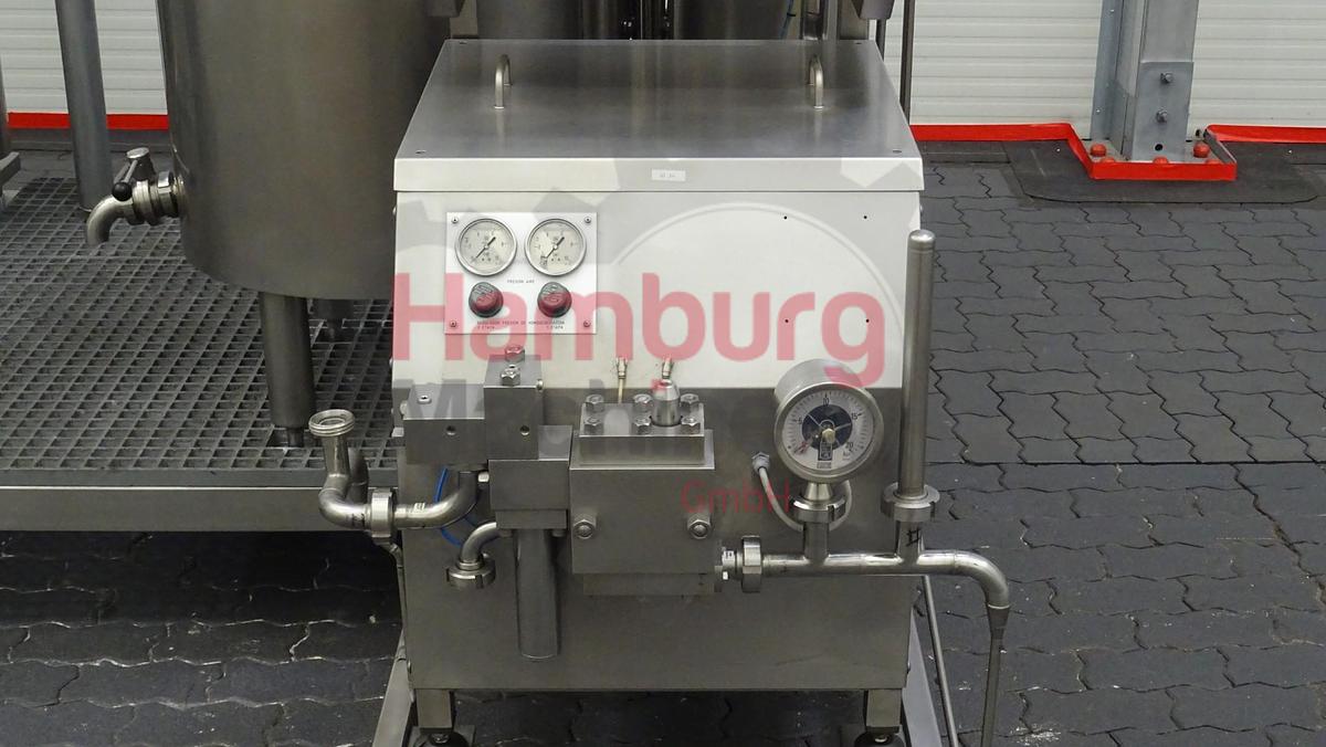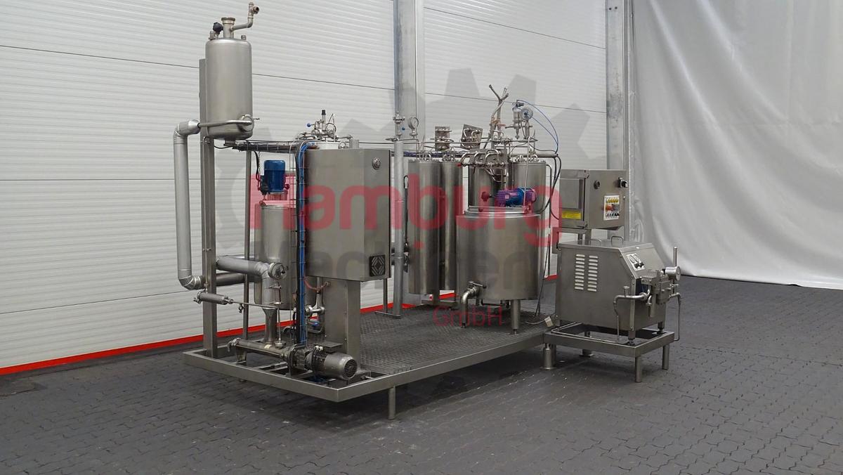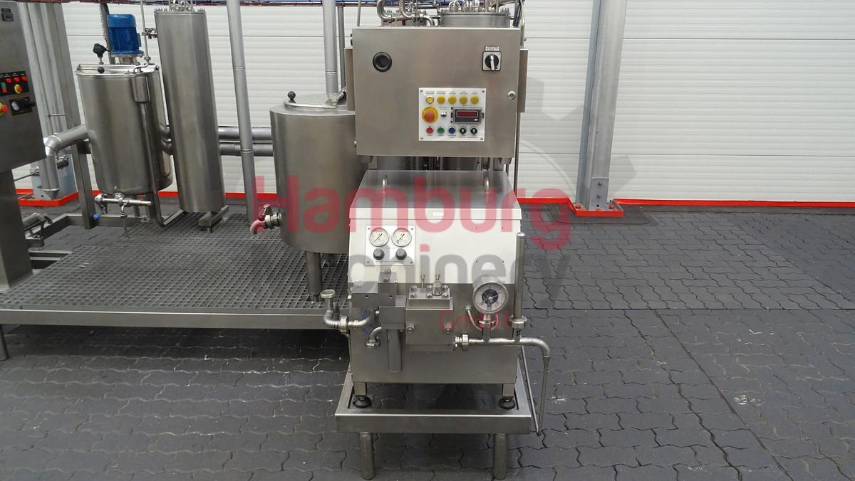 This skid mounted pilot pasteurisation plant exisiting out of a inline filter, feed screw pump (Bominox - type RS-22/M - 0,75 kW - n2: 250 rpm), level tank of ± 100 liter (internal diameter 45 cm, internal height 70 cm) with mix agitator (0,18 kW - 665 rpm), pre-heater (tubular heatexchanger), homogeniser (FBF 001), 2x tubular heaters, holding, 2 tubular coolers and a double jacketed ripening tank of ± 250 liter (internal diameter 70 cm, internal height 63 cm) with propellor agitator (0,37 kW - n2: 50 rpm). The pilot pasteurisation plant is previously used for ice cream mixture and only run for 357 production hours., The unit can be used for all kind of different combinations for pasteurisation and homogenising of liquid products, by making different connections on the flowplates., Homogeniser details:, Manufacturer: FBF Italia, Model: FBF 001, Serienr: 06031808, Year: 2006, Max. capacity: 215 ltr/h, Pressure: 250 / 50 bar, Number of stages: 2, Motor: 2,2 kW - 400 V - 50 Hz - 1.420 rpm, Including all interconnecting piping, pumps, valves, sensors, cabling and controls., Type of Machine: Pilot Pasteurisation Plant with Homogeniser, Capacity: 60 - 180 liter per hour, Type of heating / cooling: Tubular Heat Exchangers (THE), Products: Ice cream mix, Temperature Range: ± 4 - 73/75 - 83/85 - 45 - 5 °C, Production hours: 357 hours, Weight: 1.900 kg, Total dimensions: 310 x 170 x 270 cm + 100 x 70 x 130 cm