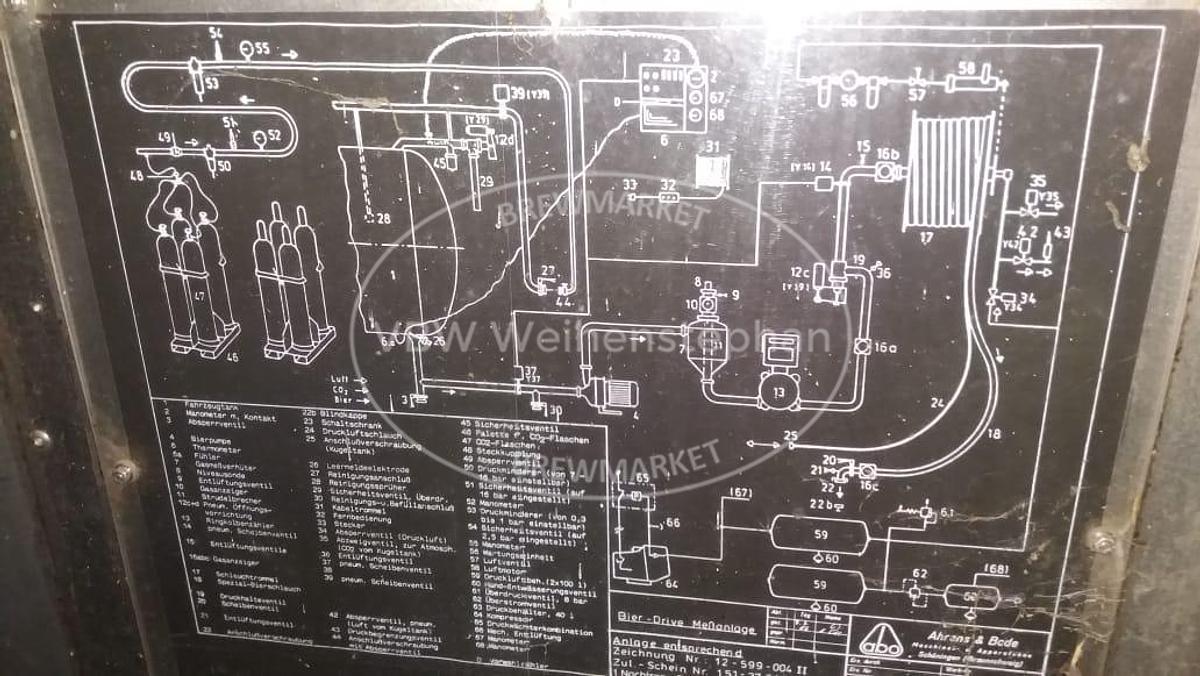 Additional title: lying tank in container, Capacity: 32 hl, Operating pressure: 2 bar, Operating temperature: 20 °C, Length: 4,65 m, Width: 2,3 m, Height: 1,95 m, Weight: 2500 kg, Features: Beer pump, thermometer, gas measurement, flow meter (Diessel), 2 cable drums, hose reel, safety valve, cleaning and filling connection, spray head, manometer, empty detection electrode Control cabinet, compressed air compressor (AltasCopco), pallet for 4 CO2 bottles, valves, pressure reducer