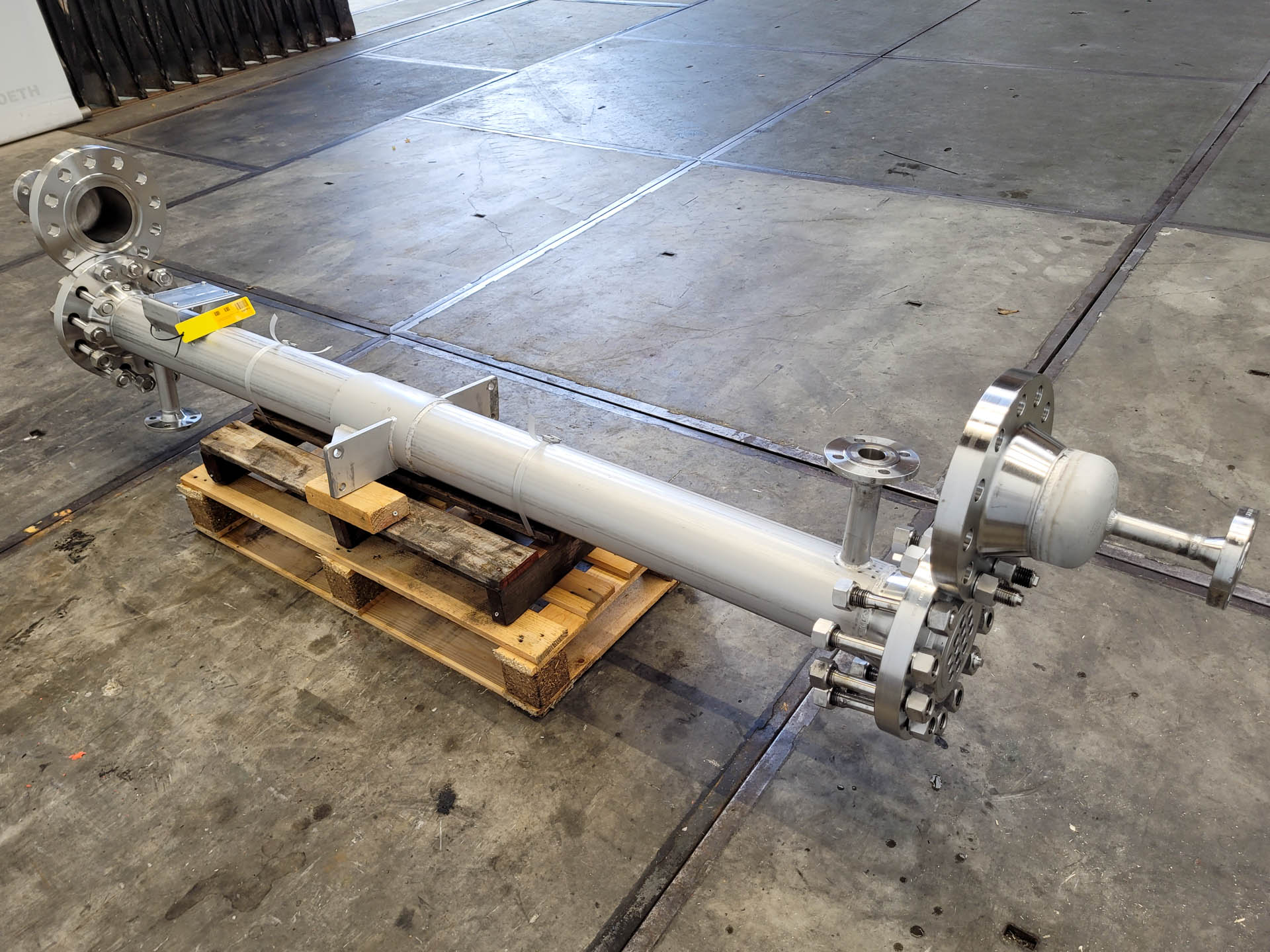 General SKU212T543 MakeKuehni LocationBarneveld Pressure Vacuum possiblecheck Vacuum possible jacketcheck Working pressure shell1 Bar Vacuum possible shellcheck Working pressure tubes6 Bar Main Features Shell (Material)Stainless steel Tube (Material)Stainless steel Surface6.3 m2 Specified Features - Shell and tube heat exchanger MaterialStainless steel 1.4571 (316Ti) Heat exchangercheck Horizontalcheck Heating surface6.3 m² Tube capacity17,5 Ltr. Number of tubes:1 Tube diameter30 mm Tube length± 13,1 m Wall thickness tubes2 mm Shell capacity41 Ltr. Shell diameter190 mm Shell length2490 mm Wall thickness shell2,6 mm Max. temperature- 200 °C Shell connectionsDN 25, DN 15 Cover connectionsDN 80, DN 40 Information No.227480 Year of construction1990 Floorspace2,6x0,55 m Total height0,35 m Weight160 kgCatalysts & fillersFeed additivesPaper & otherSolvent ...