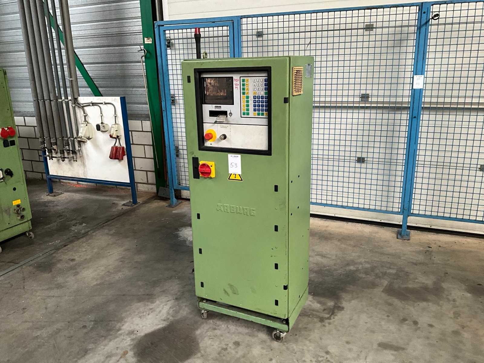 Serial Number: 154812 • Power: 400 V, 3 Phase, 50 Hz • Condition: Used • Additional Notes: Electrical data per nameplate: total current 107 A; main fuse 125 A; motor current 60 A; CE marked. Equipped with peripheral handling equipment visible (conveyors, temperature control unit, material hoses) Auction-ID: A7-40551-17