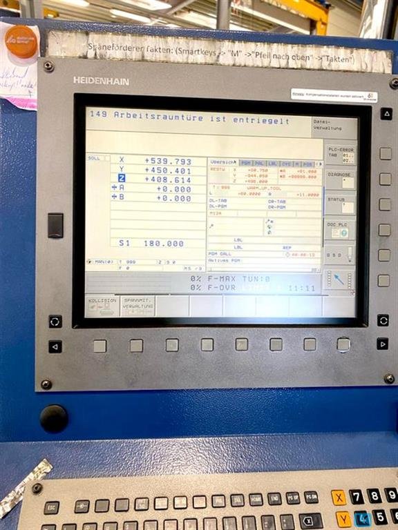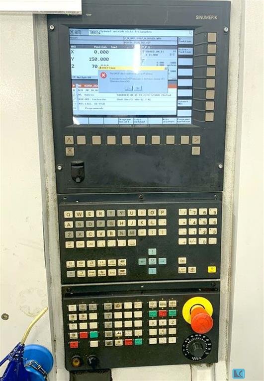 x-travel:1250 mmy-travel:880 mmz-travel:800 mmcontrol: Heidenhain TNC 430 tool change unit:60 Pos.Tool bore:SK 50 turning speeds:8000 1/minsize of pallet:1000 x 800 mmtotal power requirement:56 kVAweight of the machine ca.:14,3 tdimensions of the machine ca.:5,5 x 3 x 3,1 m5-axis machine with controlled universal milling head (B-axis),2-palett changer incl. 2 palets, 1000 x 800 mmProduction package:- internal coolant supply 40 bar with 900l coolant box (2,25 x 1.3 x 2,2m / 950kg),- chipconveyor (4,85 x 1,2 x 1,75m / 600kg),- ROTOCLEAR,- 3D touchprobe RENISHAW MP 10- 60 pos. ATC SK 50- el. handwheel - mech. tool-breakage control,accessories (SK 50 toolholdersapprox. 100.200 h "machine on", approx. 52.200 h "spindle on", last spindle change in 2020