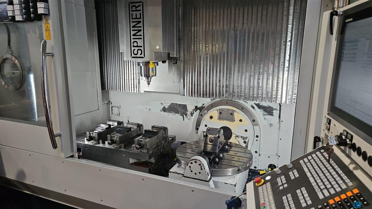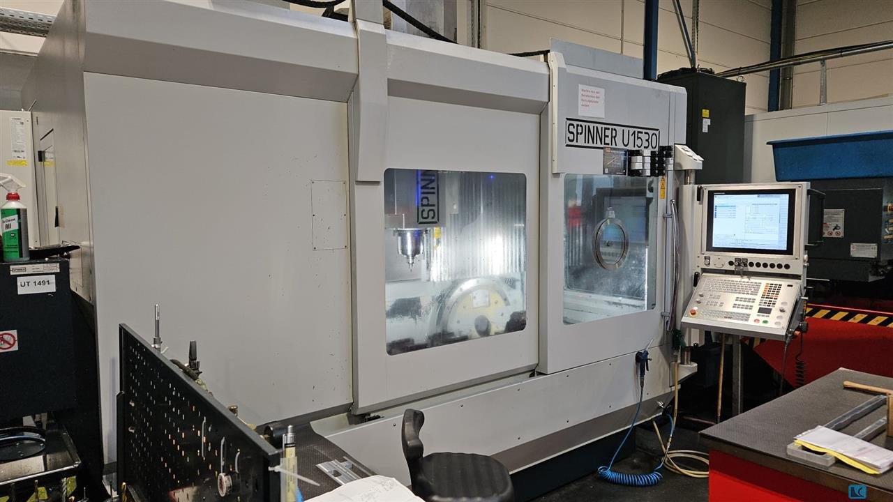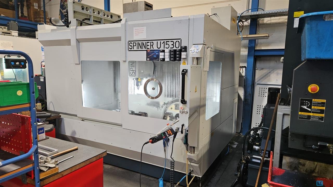 x-travel:1530 mmy-travel:530 mmz-travel:465 mmside by side, right side fixed table X =:925 mmside by side left side 2 axis table X =:780 mmcontrol:Heidenhain TNC 640 tool magazin::122 SK 40 spindle turning speed - stepless:12.000 1/minSpindle Torque:120 Nmpower capacity:22 kWFixed Table Dimensions:920 x 540 mmTable load fixed table:2000 kgMax. parts size on fixed table:900 x 500 x 400 mmDiameter of integrated 2-axis rotary table:650 mmTable load rotary table:500 kgB-axis swivel angle:-90°/+110° ° / degMax. parts size on rotary table:600 x 500 x 400 mmMax. Parts size over both tables:1500 x 500 x 400 mminternal coolant system feed:70 bar barweight of the machine ca.:10,5 tdimensions of the machine ca.:3,65 x 2,53 x 2,81 mpendant hand wheel:HR 510 FS Measuring probe for work piece:Blum TC 52 The SpinnerU5 1530 5-axis machine with Heidenhain iTNC 640 control is as new, in excelllent con ...