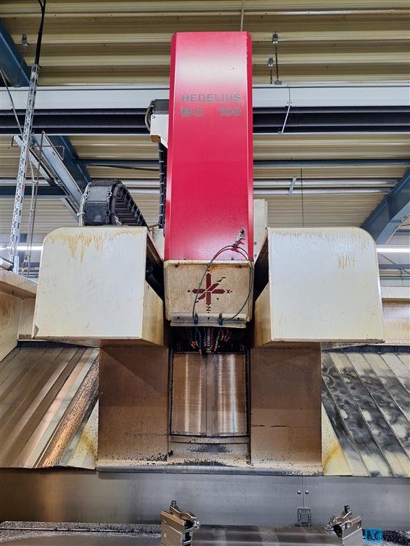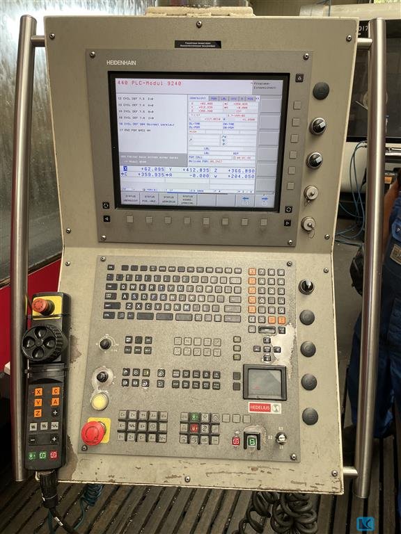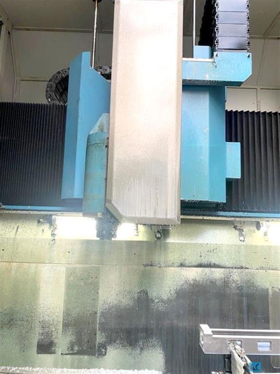 x-travel:8500 mmy-travel:2000 mmz-travel:1500 mmrapid travel x/y/z:25 m/mintable-size:10.000 x 1.350 mmtable load:max. 5 t/qmuniversal head:orthogonal 1° x 1° tool taper:SK 50 milling head speed:4.000 1/minpower capacity:37 kWmax. torque on the spindle:900 Nminternal coolant system feed:15 barcontrol:HEIDENHAIN iTNC 530 Tool changer:60 Pos. total power requirement:75 KWdimensions of the machine ca.:12,7 x 5,2 x 4,6 mweight of the machine ca.:35 tuniversal travelling column - universal machining center,orthogonal milling head, water-cooled, with 1° indexing in 2 axis (360 pos. in rear layer, 270 pos. in front layer)3D touch probe M&H 20.41,dividing wall for 2 table machining,internal air blast,15bar high pressure pump,prepared for HSC milling heads incl. torque support,moveable operator-cabin/panel,chipconveyor,handwheel HR 410,controlled security fence,miscellaneous accessories (angle ...