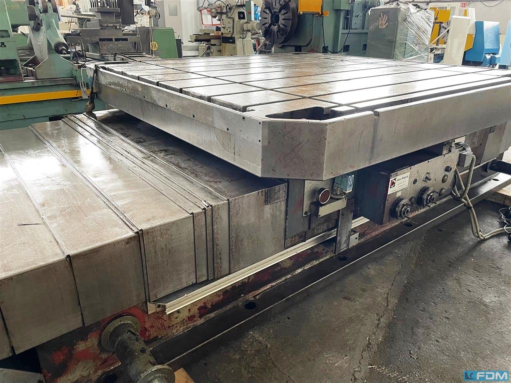 spindle diameter:150 mmx-travel:10000 mmy-travel:2500 mmbore spindle stroke:700 mmram stroke:700 dimension of the ram:340 x 340 mmspindle taper ISO:50 Speed of boring spindles:1,25 - 1250 U/min.feed speeds infinitely variable:1 - 5000 mm/minrapid traverse:5 m/mintotal power requirement:120 kWweight of the machine ca.:115 tdimensions of the machine ca.:15,1 x 10 x 6,4 mwith CNC SIEMENS 840 Dsl complete retrofit in 2010FIBRO CNC rotary table 2500 x 2500 mm, 50 to. loading capacity,longitudinal movement 2500 mm,angular milling head 4 x 90°universal milling headfloor plate area ca. 12000 x 6000 mm ( 72 m²)chip conveyor and coolant attachmentaerostatic guideways