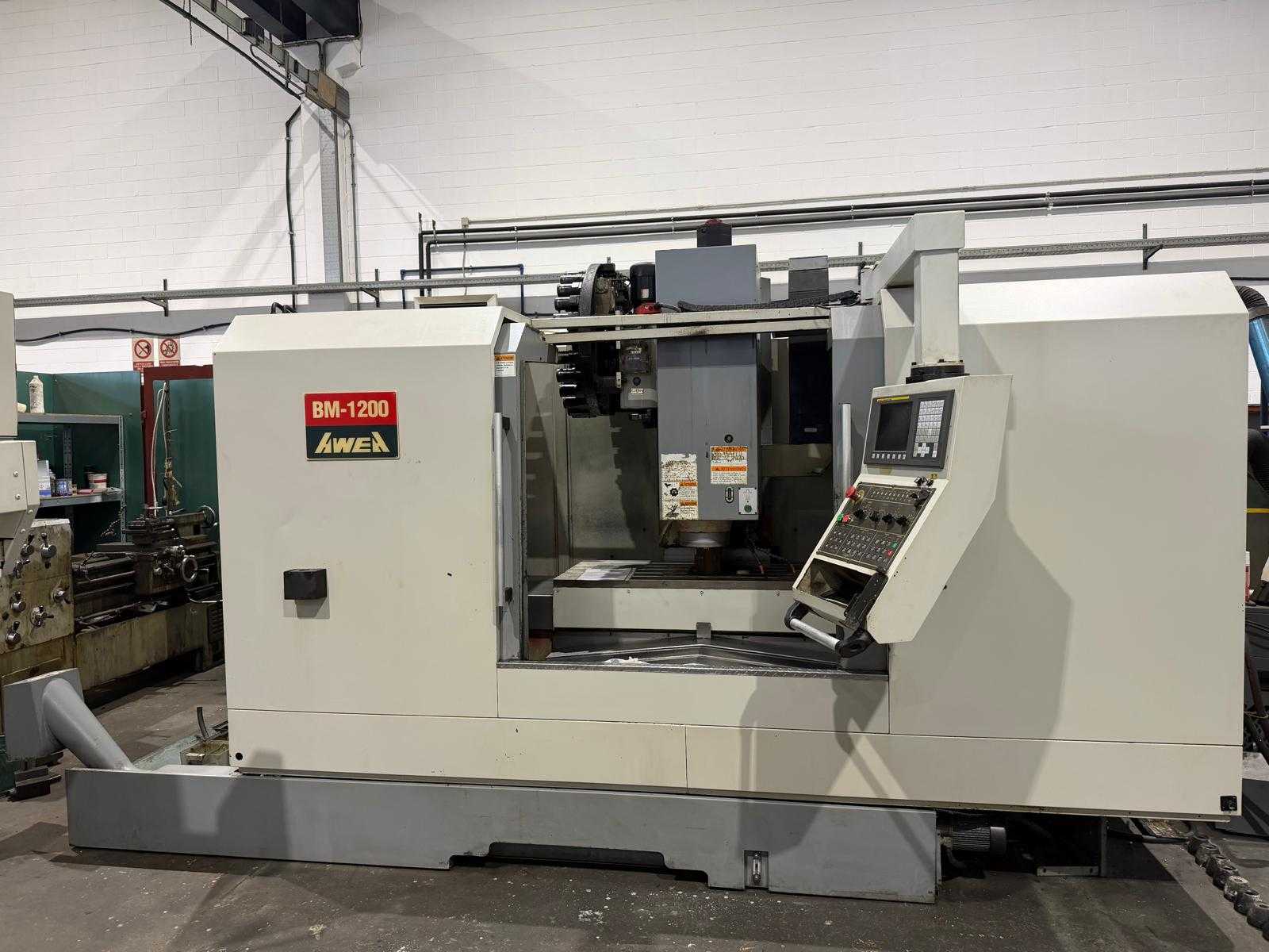 Awea BM 1200 vertical machining center X-axis travel: 1,200 mm Y-axis travel: 600 mm Z-axis travel: 600 mm Table dimensions: 1,350 x 600 mm Maximum Table Load: 1,200 kg Spindle Mount: BT-40 Total Machine Weight: approx. 8,500 - 9,000 kg Ground Clearance (W x D): 3,200 x 2,400 mm Maximum Height: 2,600 mm Auction-ID: A7-44885-10