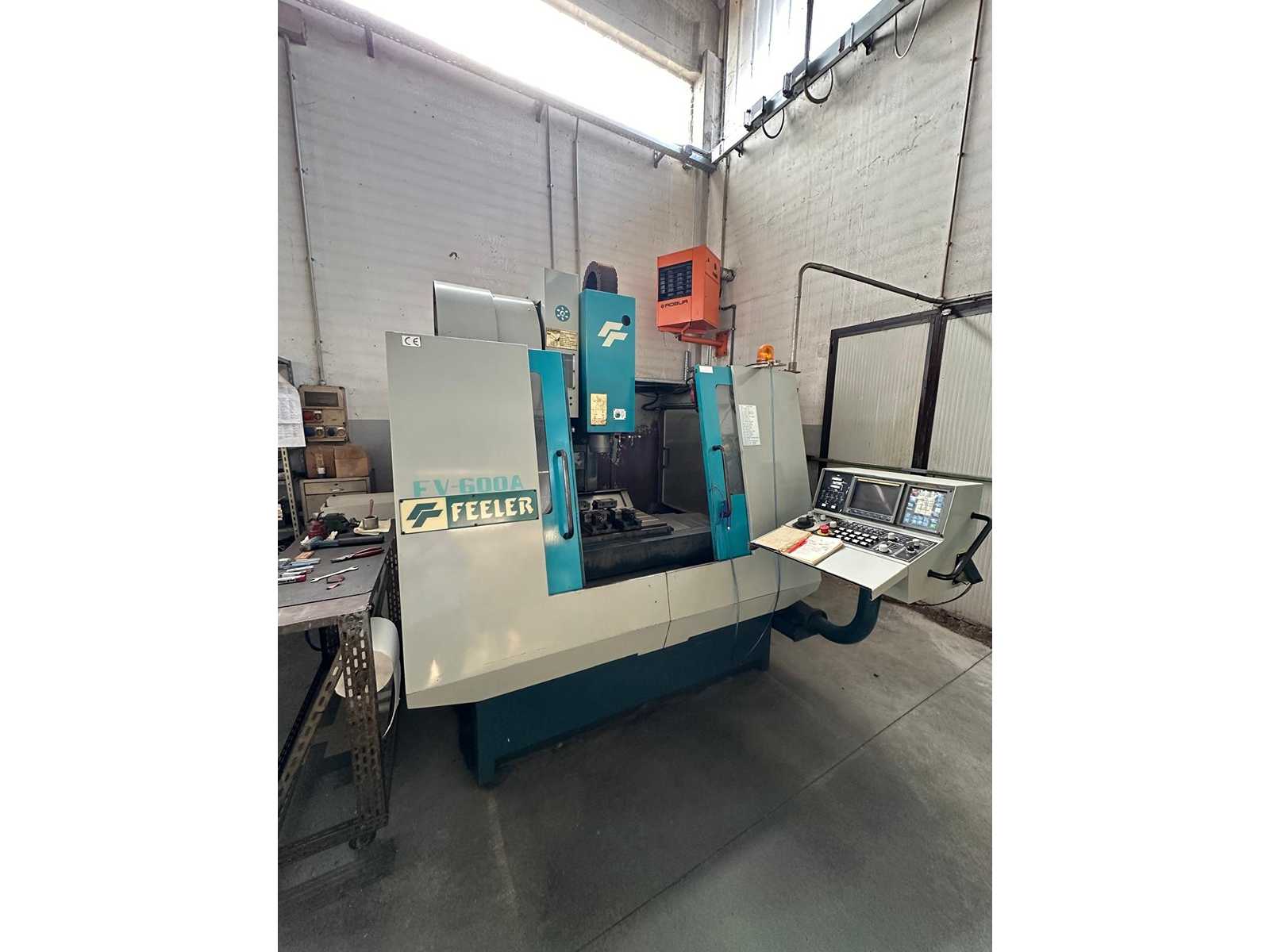 FEELER FV 600 A vertical machining center Base: Stabilized Meehanite cast iron X-stroke: 600 mm Y stroke: 400 mm Z stroke: 450 mm Table: 700 x 400 mm Max load: 350 kg Spindle: 8,000 - 10,000 RPM Mount: BT 40 / ISO 40 Motor: 5.5 / 7.5 kW Tool Changer (ATC): 20 Random Positions Guides: Linear recirculating ball bearings Rapid: 24 - 30 m/min CNC: Fanuc Series 0-MC Accuracy: ±0.005 mm Weight: approx. 3,200 kg Overall dimensions: 2000 x 2200 x h 2200 mm Auction-ID: A7-44885-19