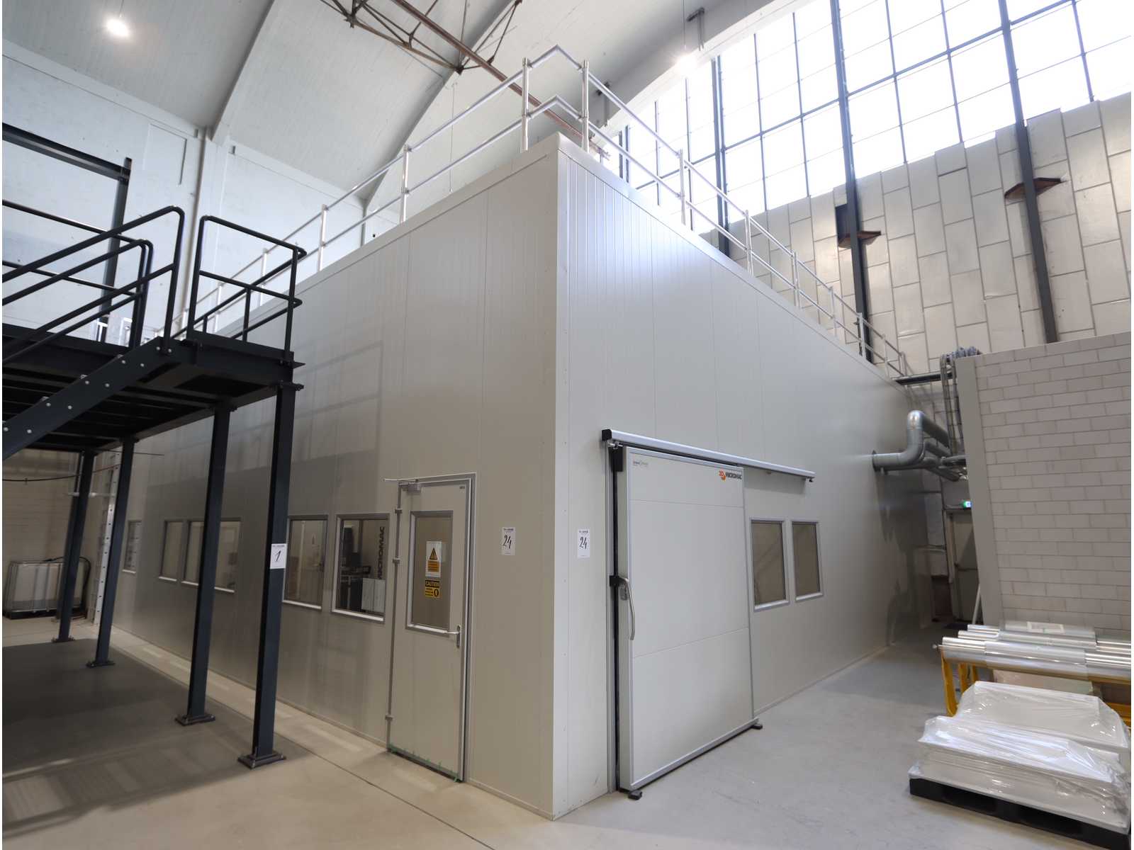 3-sided with sliding door, 8 windows, entrance door, overhanging travelling crane with Konecranes” electrical chain hoist capacity 1250kg, LED light fixtures, steel construction and top built Robatherm” air treatment unit type Tl50-09/12, capacity 7640m3, consisting of: 2 filter units, 2 silencers, 2 ventilators, humidifier unit and built-on E-heater,(cooling unit not included) Auction-ID: A1-43459-24